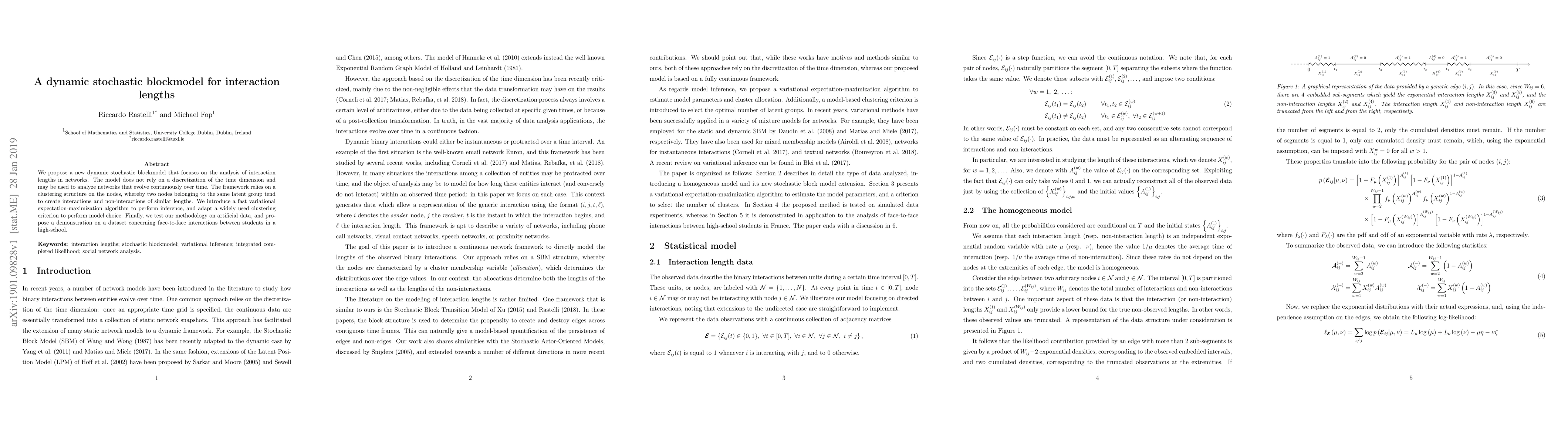 We propose a new dynamic stochastic blockmodel that focuses on the analysis of interaction lengths in networks. The model does not rely on a discretization of the time dimension and may be used to analyze networks that evolve continuously over time. The framework relies on a clustering structure on the nodes, whereby two nodes belonging to the same latent group tend to create interactions and non-interactions of similar lengths. We introduce a fast variational expectation-maximization algorithm to perform inference, and adapt a widely used clustering criterion to perform model choice. Finally, we test our methodology on artificial data, and propose a demonstration on a dataset concerning face-to-face interactions between students in a high-school.