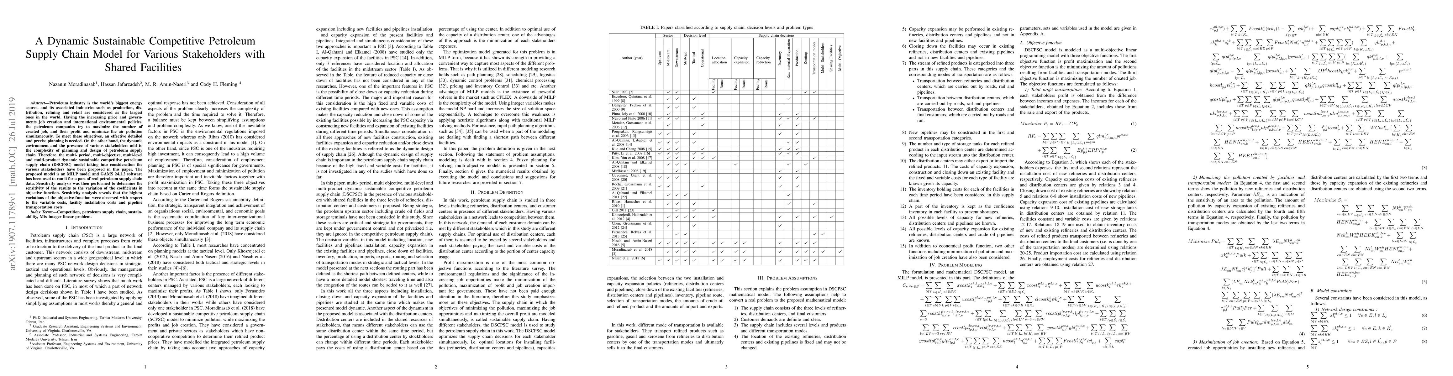 This paper proposes a multi-period, multi-objective, multi-level, and multi-product dynamic sustainable competitive petroleum supply chain model (DSCPSC) to optimize job creation, profit, and minimize air pollution. The model, implemented using GAMS software, demonstrates sensitivity to variable costs, facility installation costs, and pipeline transportation costs.