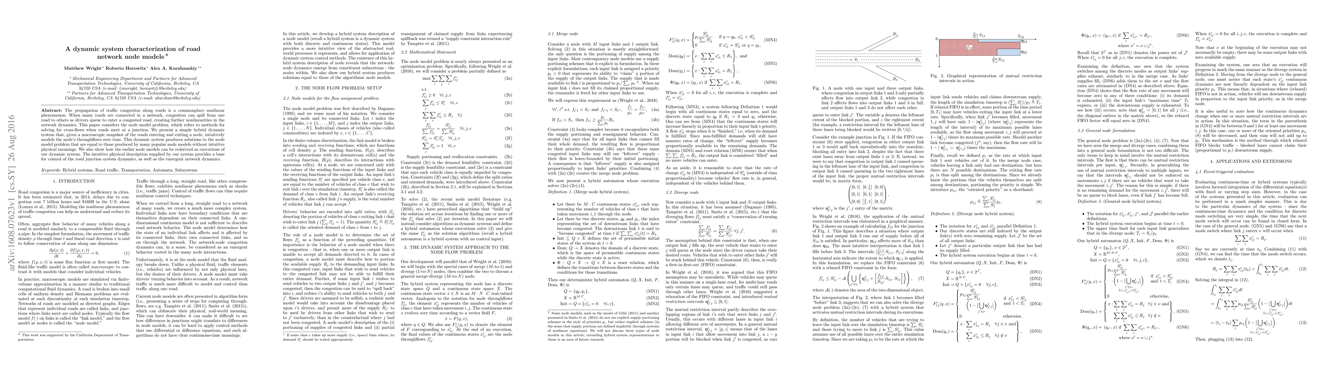 The propagation of traffic congestion along roads is a commonplace nonlinear phenomenon. When many roads are connected in a network, congestion can spill from one road to others as drivers queue to enter a congested road, creating further nonlinearities in the network dynamics. This paper considers the node model problem, which refers to methods for solving for cross-flows when roads meet at a junction. We present a simple hybrid dynamic system that, given a macroscopic snapshot of the roads entering and exiting a node, intuitively models the node's throughflows over time. This dynamic system produces solutions to the node model problem that are equal to those produced by many popular node models without intuitive physical meanings. We also show how the earlier node models can be rederived as executions of our dynamic system. The intuitive physical description supplied by our system provides a base for control of the road junction system dynamics, as well as the emergent network dynamics.