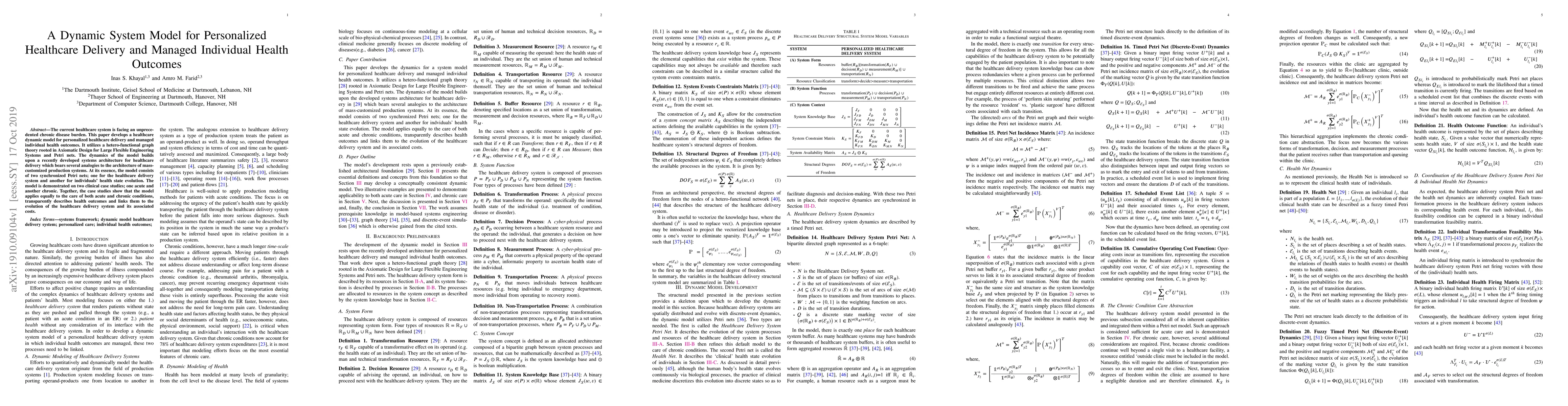 The current healthcare system is facing an unprecedented chronic disease burden. This paper develops a healthcare dynamic model for personalized healthcare delivery and managed individual health outcomes. It utilizes a hetero-functional graph theory rooted in Axiomatic Design for Large Flexible Engineering Systems and Petri nets. The dynamics of the model builds upon a recently developed systems architecture for healthcare delivery which bears several analogies to the architecture of mass-customized production systems. At its essence, the model consists of two synchronized Petri nets; one for the healthcare delivery system and another for individuals' health state evolution. The model is demonstrated on two clinical case studies; one acute and another chronic. Together, the case studies show that the model applies equally to the care of both acute and chronic conditions, transparently describes health outcomes and links them to the evolution of the healthcare delivery system and its associated costs.