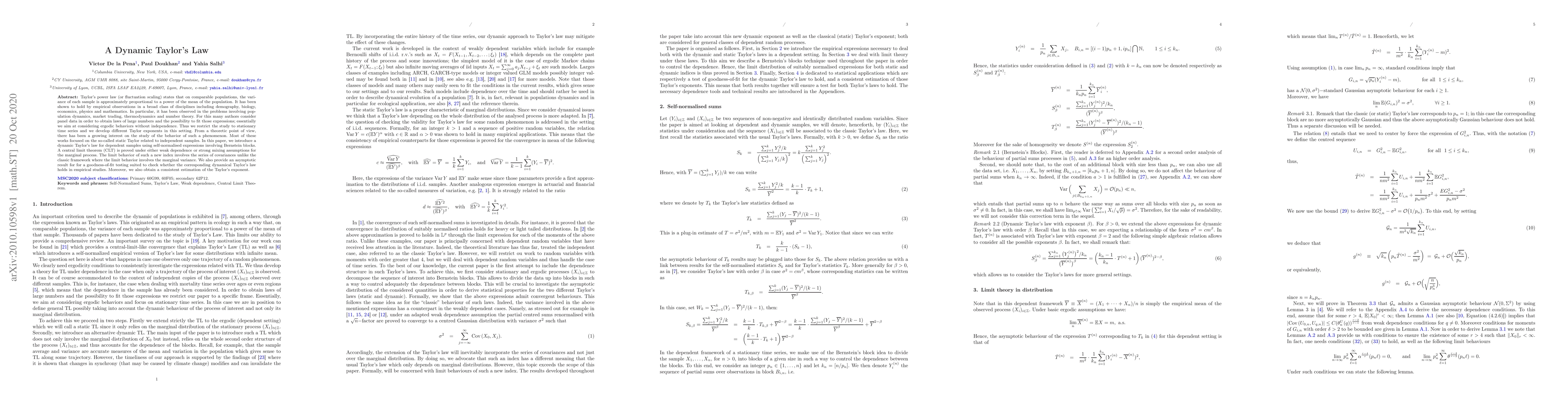 Taylor's power law (or fluctuation scaling) states that on comparable populations, the variance of each sample is approximately proportional to a power of the mean of the population. It has been shown to hold by empirical observations in a broad class of disciplines including demography, biology, economics, physics and mathematics. In particular, it has been observed in the problems involving population dynamics, market trading, thermodynamics and number theory. For this many authors consider panel data in order to obtain laws of large numbers and the possibility to fit those expressions; essentially we aim at considering ergodic behaviors without independence. Thus we restrict the study to stationary time series and we develop different Taylor exponents in this setting. From a theoretic point of view, there has been a growing interest on the study of the behavior of such a phenomenon. Most of these works focused on the so-called static Taylor related to independent samples. In this paper, we introduce a dynamic Taylor's law for dependent samples using self-normalised expressions involving Bernstein blocks. A central limit theorem (CLT) is proved under either weak dependence or strong mixing assumptions for the marginal process. The limit behavior of such a new index involves the series of covariances unlike the classic framework where the limit behavior involves the marginal variance. We also provide an asymptotic result for for a goodness-of-fit testing suited to check whether the corresponding dynamical Taylor's law holds in empirical studies. Moreover, we also obtain a consistent estimation of the Taylor's exponent.