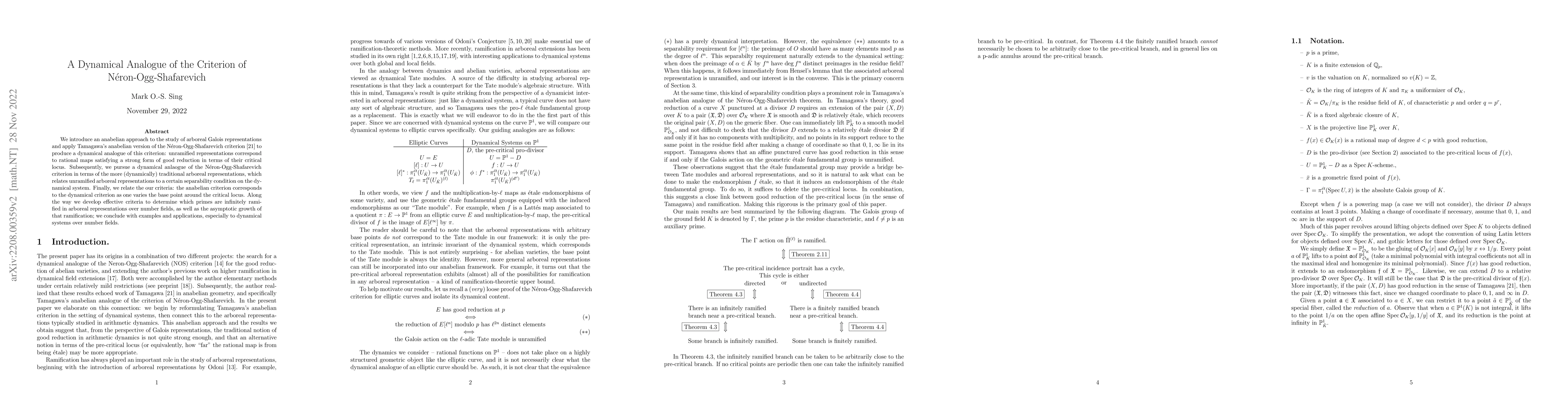 We introduce an anabelian approach to the study of arboreal Galois representations and apply Tamagawa's anabelian version of the N\'eron-Ogg-Shafarevich criterion to produce a dynamical analogue of this criterion: unramified representations correspond to rational maps satisfying a strong form of good reduction in terms of their critical locus. Subsequently, we pursue a dynamical anlaogue of the N\'eron-Ogg-Shafarevich criterion in terms of the more (dynamically) traditional arboreal representations, which relates unramified arboreal representations to a certain separability condition on the dynamical system. Finally, we relate the our criteria: the anabelian criterion corresponds to the dynamical criterion as one varies the base point around the critical locus. Along the way we develop effective criteria to determine which primes are infinitely ramified in arboreal representations over number fields, as well as the asymptotic growth of that ramification; we conclude with examples and applications, especially to dynamical systems over number fields.