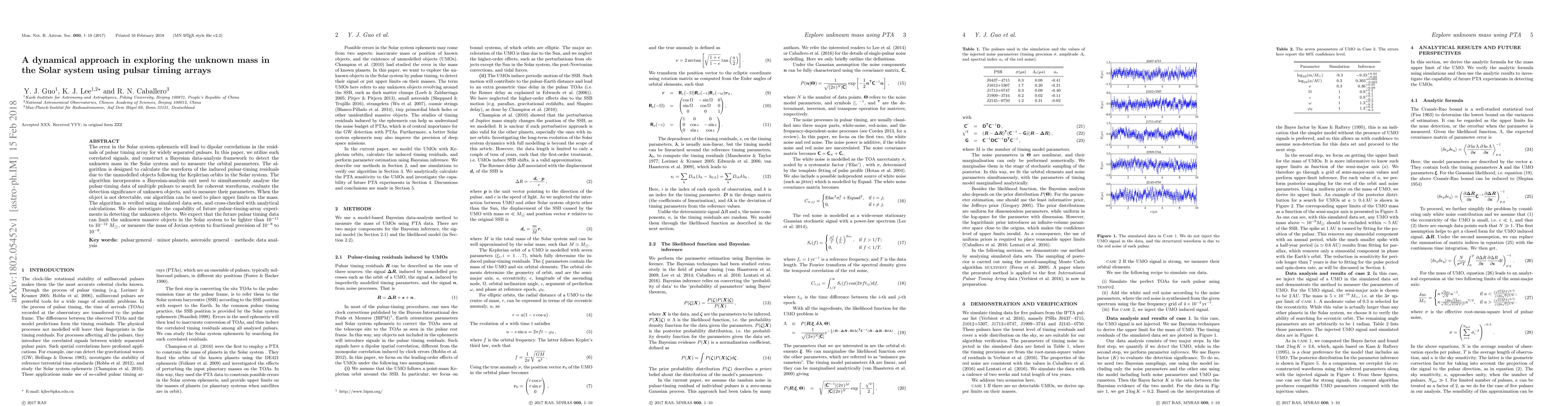 The error in the Solar system ephemeris will lead to dipolar correlations in the residuals of pulsar timing array for widely separated pulsars. In this paper, we utilize such correlated signals, and construct a Bayesian data-analysis framework to detect the unknown mass in the Solar system and to measure the orbital parameters. The algorithm is designed to calculate the waveform of the induced pulsar-timing residuals due to the unmodelled objects following the Keplerian orbits in the Solar system. The algorithm incorporates a Bayesian-analysis suit used to simultaneously analyse the pulsar-timing data of multiple pulsars to search for coherent waveforms, evaluate the detection significance of unknown objects, and to measure their parameters. When the object is not detectable, our algorithm can be used to place upper limits on the mass. The algorithm is verified using simulated data sets, and cross-checked with analytical calculations. We also investigate the capability of future pulsar-timing-array experiments in detecting the unknown objects. We expect that the future pulsar timing data can limit the unknown massive objects in the Solar system to be lighter than $10^{-11}$ to $10^{-12}$ $M_{\odot}$, or measure the mass of Jovian system to fractional precision of $10^{-8}$ to $10^{-9}$.