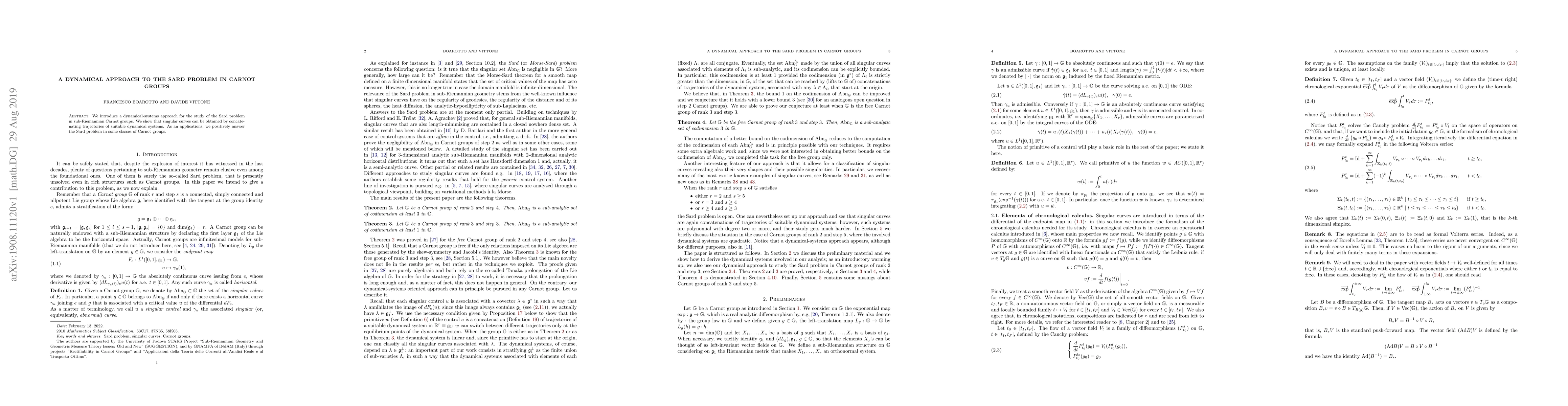 This research introduces a dynamical-systems method to tackle the Sard problem in Carnot groups, demonstrating that singular curves can be constructed from concatenated dynamical system trajectories, successfully addressing the Sard problem in certain Carnot group classes.