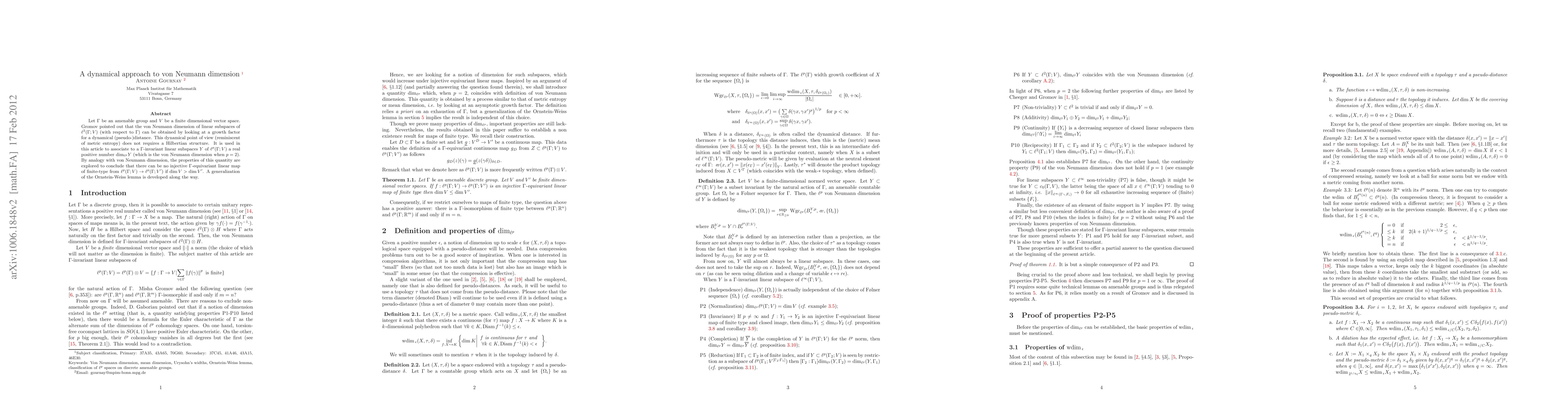 The paper introduces a dynamical approach to calculating von Neumann dimension in amenable groups, showing that injective linear maps between l^p spaces with finite-type cannot exist if the target space has higher dimensionality.