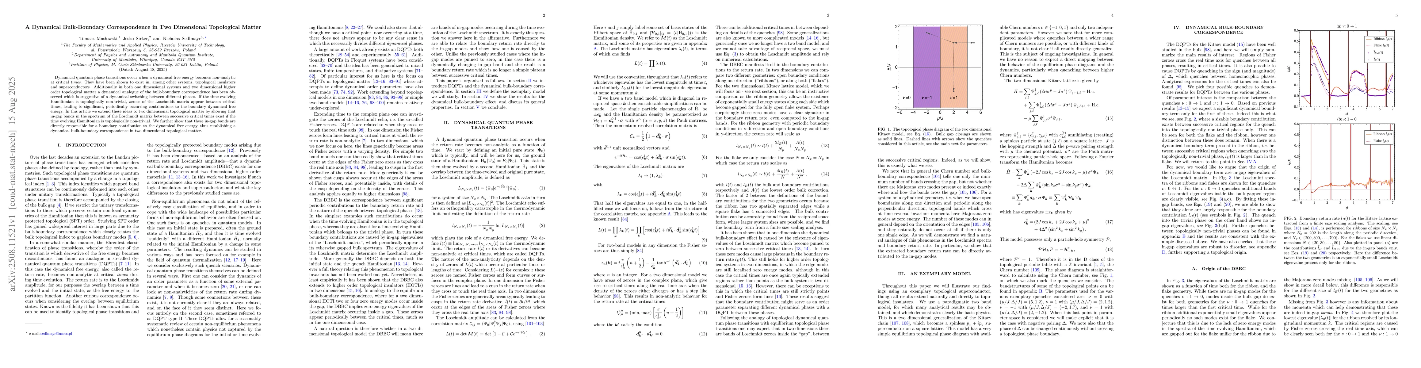 Dynamical quantum phase transitions occur when a dynamical free energy becomes non-analytic at critical \emph{times}. They have been shown to exist in, among other systems, topological insulators and superconductors. Additionally in both one dimensional systems and two dimensional higher order topological matter a dynamical analogue of the bulk-boundary correspondence has been observed which is suggestive of a dynamical switching between different phases. If the time evolving Hamiltonian is topologically non-trivial, zeroes of the Loschmidt matrix appear between critical times, leading to significant, periodically occurring contributions to the boundary dynamical free energy. In this article we extend these ideas to two dimensional topological matter by showing that in-gap bands in the spectrum of the Loschmidt matrix between successive critical times exist if the time evolving Hamiltonian is topologically non-trivial. We further show that these in-gap bands are directly responsible for a boundary contribution to the dynamical free energy, thus establishing a dynamical bulk-boundary correspondence in two dimensional topological matter.