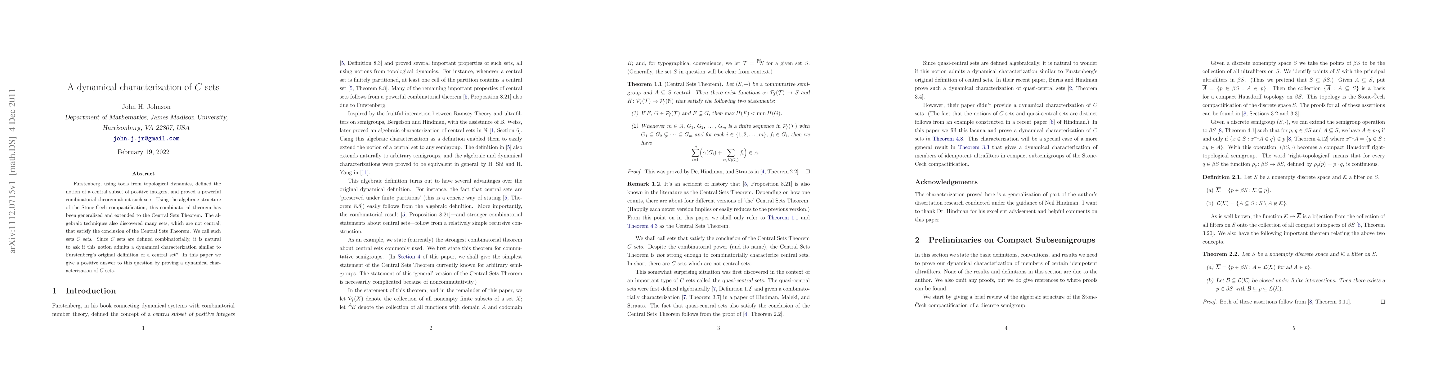This paper proves a dynamical characterization of C sets, which are combinatorially defined sets satisfying the conclusion of the Central Sets Theorem, extending Furstenberg's original notion of central sets using tools from topological dynamics.