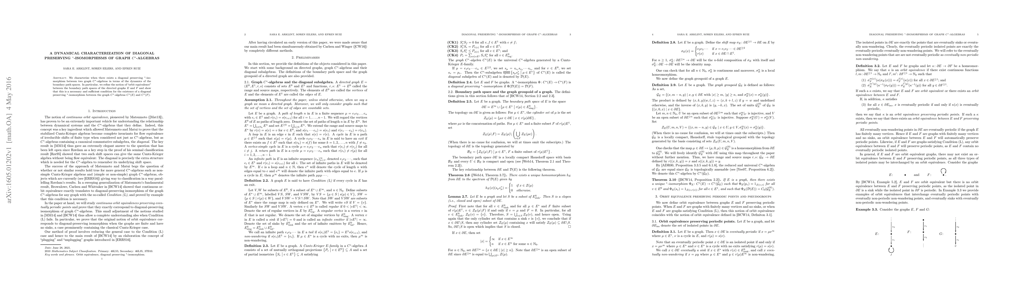 We characterize when there exists a diagonal preserving $*$-isomorphism between two graph $C^*$-algebras in terms of the dynamics of the boundary path spaces. In particular, we refine the notion of "orbit equivalence" between the boundary path spaces of the directed graphs $E$ and $F$ and show that this is a necessary and sufficient condition for the existence of a diagonal preserving $*$-isomorphism between the graph $C^*$-algebras $C^*(E)$ and $C^*(F)$.