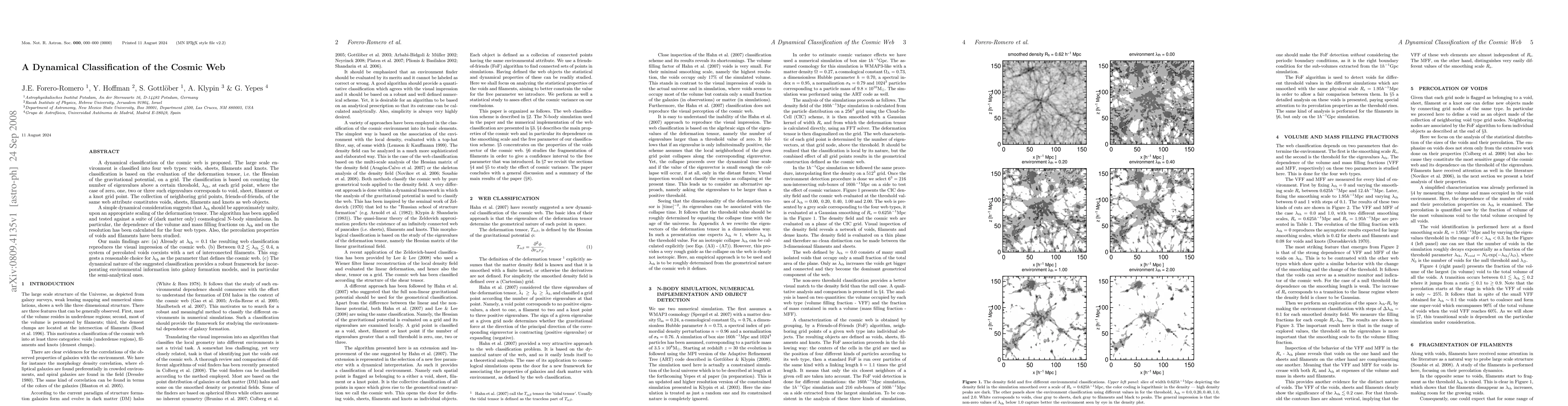 This paper proposes a dynamical classification of the cosmic web into four types: voids, sheets, filaments, and knots, based on the evaluation of the deformation tensor. The classification effectively reproduces the cosmic web structure at lambda_th = 0.1 and suggests a range (0.2 < lambda_th < 0.4) where percolated voids coexist with interconnected filaments, offering a robust framework for galaxy formation models.