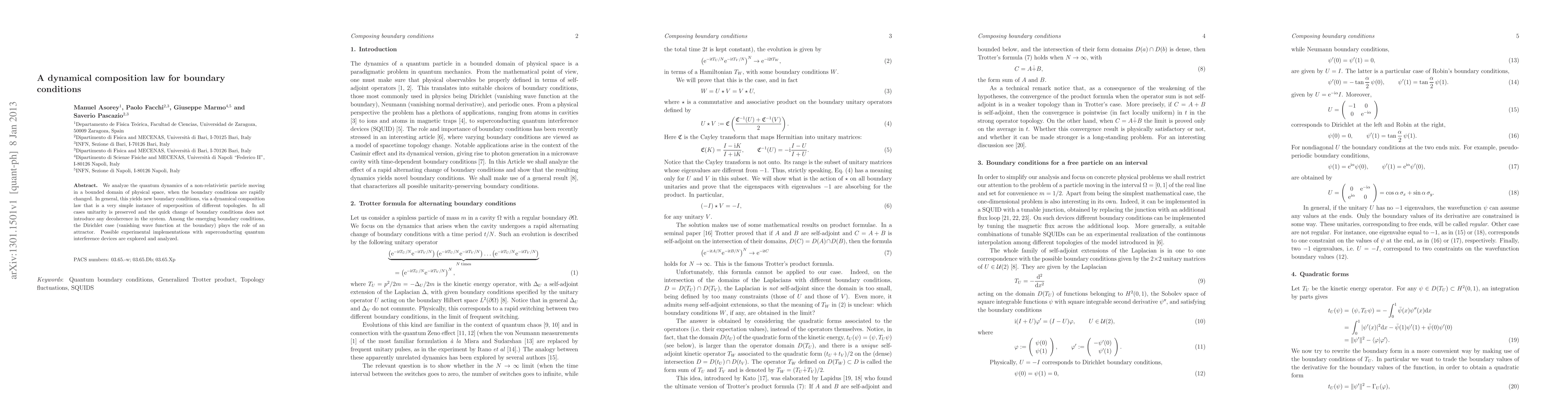 We analyze the quantum dynamics of a non-relativistic particle moving in a bounded domain of physical space, when the boundary conditions are rapidly changed. In general, this yields new boundary conditions, via a dynamical composition law that is a very simple instance of superposition of different topologies. In all cases unitarity is preserved and the quick change of boundary conditions does not introduce any decoherence in the system. Among the emerging boundary conditions, the Dirichlet case (vanishing wave function at the boundary) plays the role of an attractor. Possible experimental implementations with superconducting quantum interference devices are explored and analyzed.