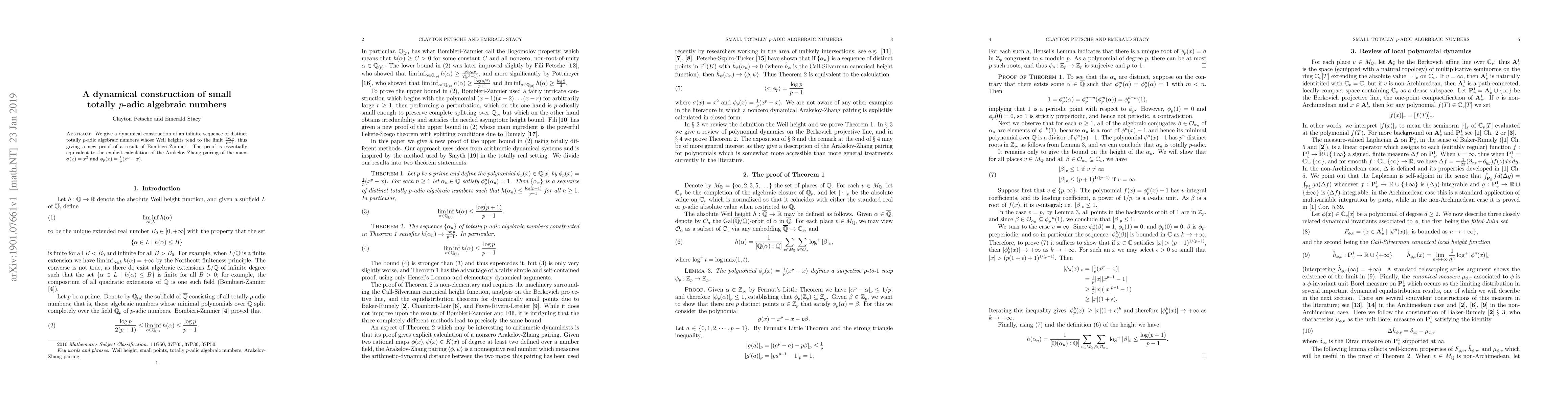This paper presents a dynamical method to generate an infinite sequence of distinct totally $p$-adic algebraic numbers, proving a result by Bombieri-Zannier that their Weil heights converge to $\frac{\log p}{p-1}$, through the explicit calculation of the Arakelov-Zhang pairing for specific maps.