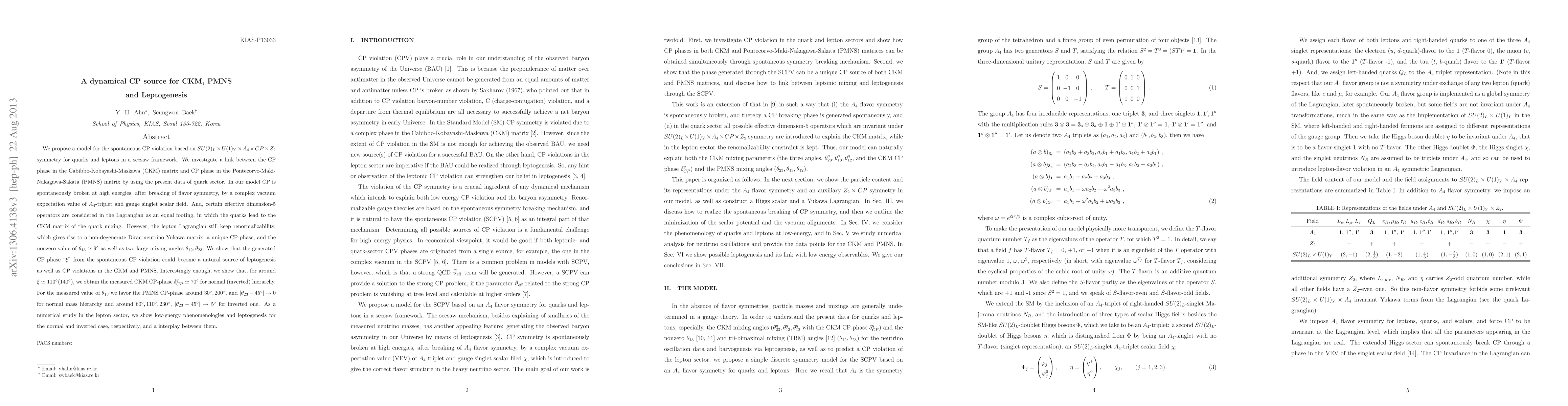 We propose a simple model for the spontaneous CP violation based on $SU(2)_{L}\times U(1)_{Y}\times A_{4}\times CP\times Z_{2}$ symmetry for quarks and leptons in a seesaw framework. In our model CP is spontaneously broken at high energies, after breaking of flavor symmetry, by a complex vacuum expectation value of $A_{4}$-triplet and gauge singlet scalar field. And, certain effective dimension-5 operators are introduced in the quark Lagrangian as an equal footing, which lead the quark mixing matrix to the Cabibbo-Kobayashi-Maskawa (CKM) one in the form, while the lepton Lagrangian is renormalizable, which gives rise to a non-degenerate Dirac neutrino Yukawa matrix and an unique CP-phase, and which in turn explains the non-zero value of $\theta_{13}\simeq9^{\circ}$ and two large mixing angles $\theta_{12}, \theta_{23}$. We show that the spontaneously generated CP phase "$\xi$" could become a natural source of leptogenesis as well as CP violations in the CKM and Pontecorvo-Maki-Nakagawa-Sakata (PMNS). Moreover, we provide a solution for the strong CP problem. Interestingly enough, we show that, for around $\xi\simeq120^{\circ}$, the quarks lead to the correct CKM CP-phase corresponding to $\delta^{q}_{CP}\simeq67^{\circ}$, while the leptons with the measured value of $\theta_{13}$ favor $\delta_{CP}=$, $|\theta_{23}-45^{\circ}|\rightarrow0$ for normal mass hierarchy and $\delta_{CP}=$, $|\theta_{23}-45^{\circ}|\rightarrow5^{\circ}$ for inverted one. As a numerical study in the lepton sector, we show low-energy phenomenologies and leptogenesis for the normal and inverted case, respectively, and a link between them.