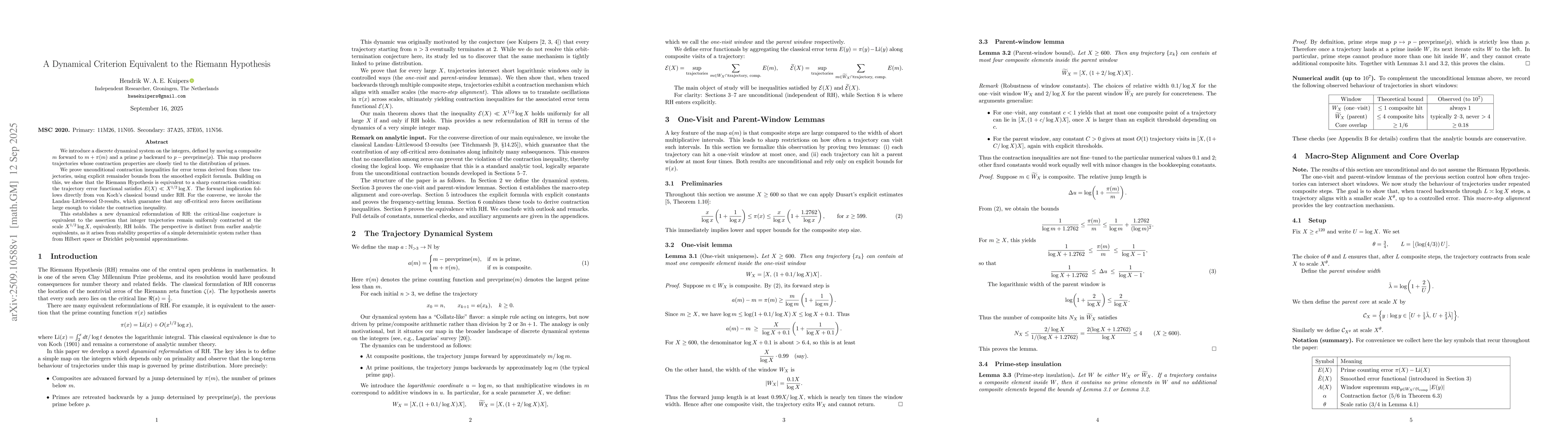We introduce a discrete dynamical system on the integers, defined by moving a composite $m$ forward to $m+\pi(m)$ and a prime $p$ backward to $p-\mathrm{prevprime}(p)$. This map produces trajectories whose contraction properties are closely tied to the distribution of primes. We prove unconditional contraction inequalities for error terms derived from these trajectories, using explicit remainder bounds from the smoothed explicit formula. Building on this, we show that the Riemann Hypothesis is equivalent to a sharp contraction condition: the trajectory error functional satisfies $E(X)\ll X^{1/2}\log X$. The forward implication follows directly from von Koch's classical bound under RH. For the converse, we invoke the Landau--Littlewood $\Omega$-results, which guarantee that any off-critical zero forces oscillations large enough to violate the contraction inequality. This establishes a new dynamical reformulation of RH: the critical-line conjecture is equivalent to the assertion that integer trajectories remain uniformly contracted at the scale $X^{1/2}\log X$, equivalently, RH holds. The perspective is distinct from earlier analytic equivalents, as it arises from stability properties of a simple deterministic system rather than from Hilbert space or Dirichlet polynomial approximations.