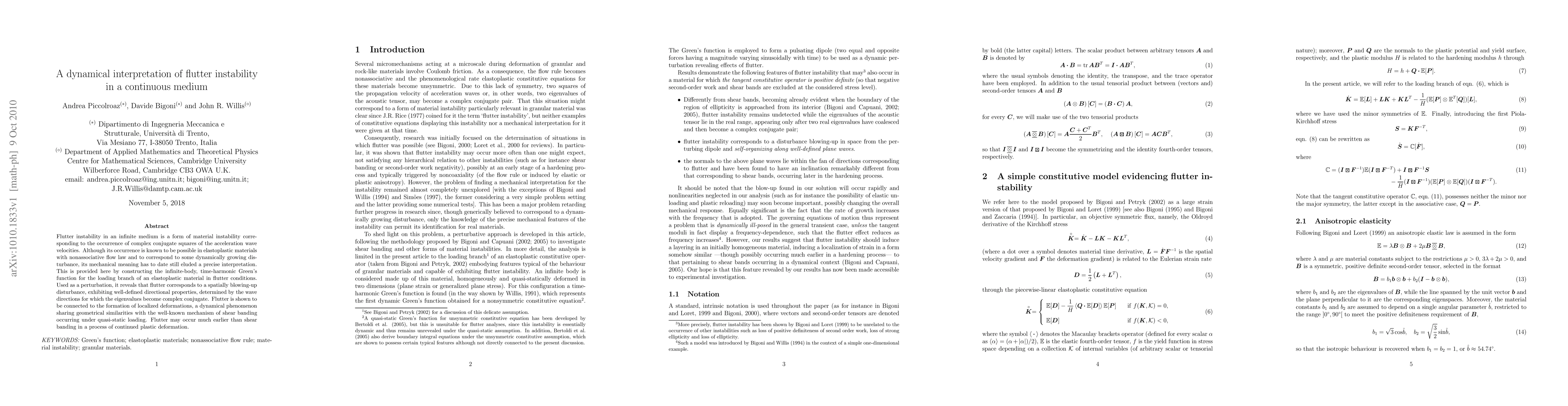 Flutter instability in an infinite medium is a form of material instability corresponding to the occurrence of complex conjugate squares of the acceleration wave velocities. Although its occurrence is known to be possible in elastoplastic materials with nonassociative flow law and to correspond to some dynamically growing disturbance, its mechanical meaning has to date still eluded a precise interpretation. This is provided here by constructing the infinite-body, time-harmonic Green's function for the loading branch of an elastoplastic material in flutter conditions. Used as a perturbation, it reveals that flutter corresponds to a spatially blowing-up disturbance, exhibiting well-defined directional properties, determined by the wave directions for which the eigenvalues become complex conjugate. Flutter is shown to be connected to the formation of localized deformations, a dynamical phenomenon sharing geometrical similarities with the well-known mechanism of shear banding occurring under quasi-static loading. Flutter may occur much earlier than shear banding in a process of continued plastic deformation.