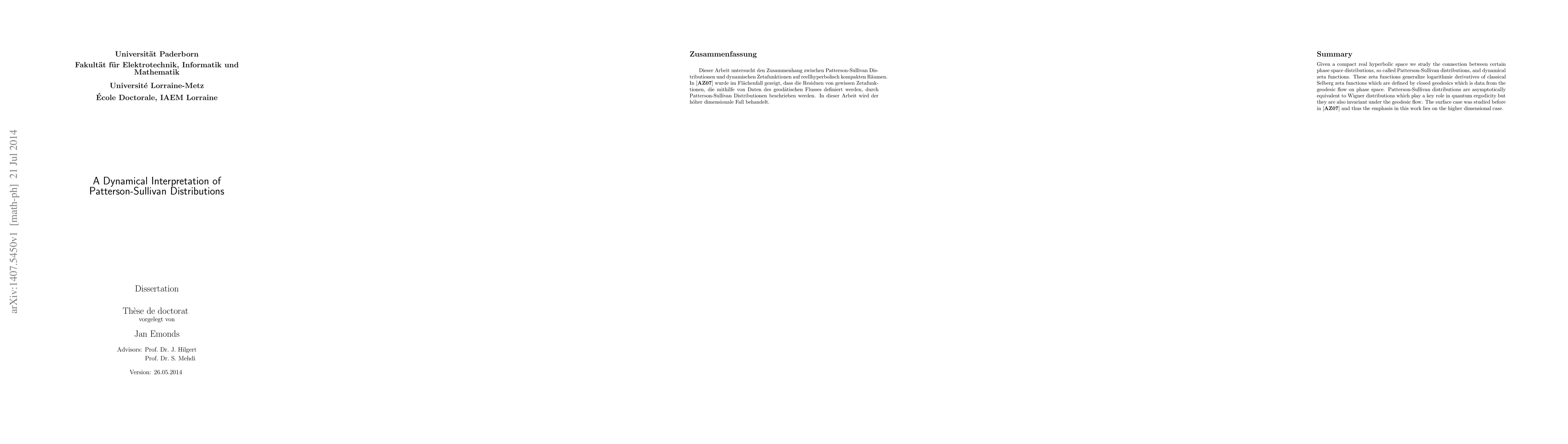 This paper explores the relationship between Patterson-Sullivan distributions and dynamical zeta functions in higher-dimensional compact real hyperbolic spaces, extending previous studies on surfaces. The focus is on how these distributions, which are invariant under geodesic flow and asymptotically related to Wigner distributions, generalize classical Selberg zeta functions.