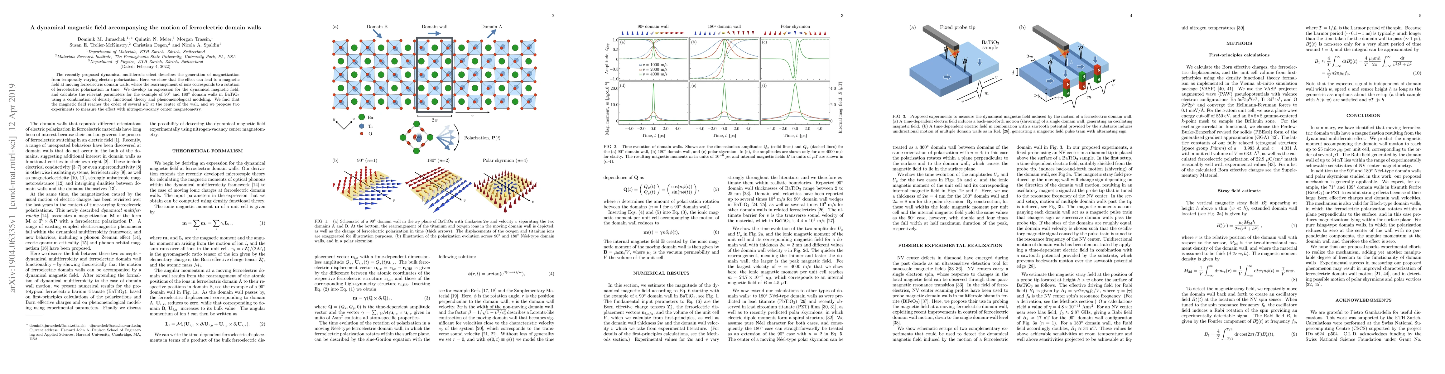 This paper demonstrates that a dynamical magnetic field can accompany the motion of ferroelectric domain walls, resulting from the temporal variation of electric polarization. The study calculates the magnetic field strength for 90$^\circ$ and 180$^\circ$ domain walls in BaTiO$_3$, finding it to be in the order of several $\mu$T, and proposes nitrogen-vacancy center magnetometry as a method to measure this effect.