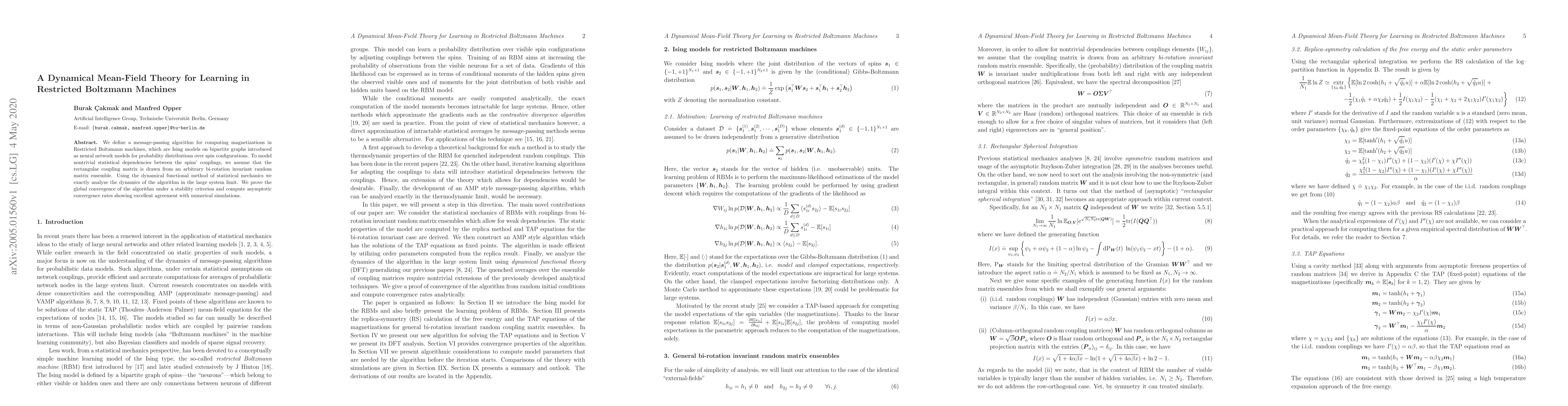 This paper introduces a message-passing algorithm for computing magnetizations in Restricted Boltzmann Machines, proving its global convergence and computing asymptotic convergence rates, which aligns well with numerical simulations. The analysis leverages the dynamical functional method from statistical mechanics to handle complex statistical dependencies in the coupling matrix.