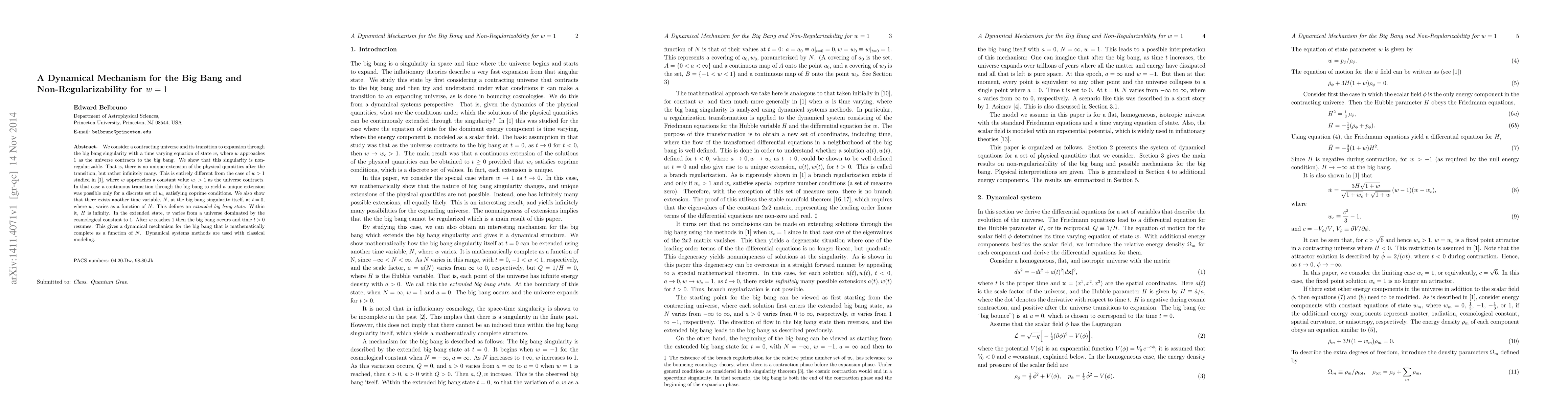 This paper explores a contracting universe transitioning to expansion via a big bang singularity with a time-varying equation of state $w$ approaching $1$. It demonstrates that this singularity is non-regularizable, contrasting with scenarios where $w > 1$, and introduces an extended big bang state where $w$ varies from cosmological constant dominance to $1$, providing a dynamical mechanism for the big bang.