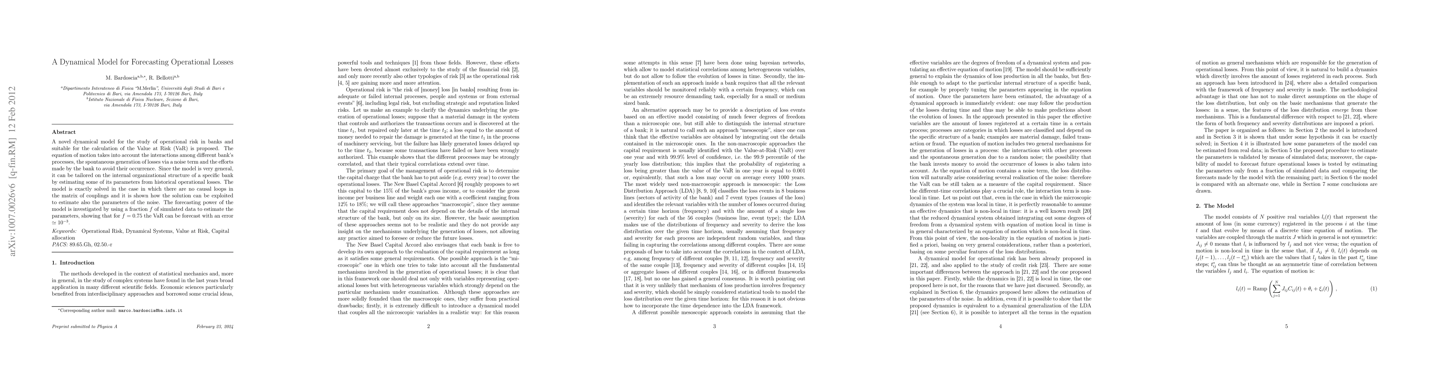 A new dynamical model is proposed to forecast operational losses in banks, incorporating interactions among processes, noise, and efforts to avoid losses. The model can accurately predict Value at Risk (VaR) with an error of approximately 10^-3 when using 75% of simulated data.