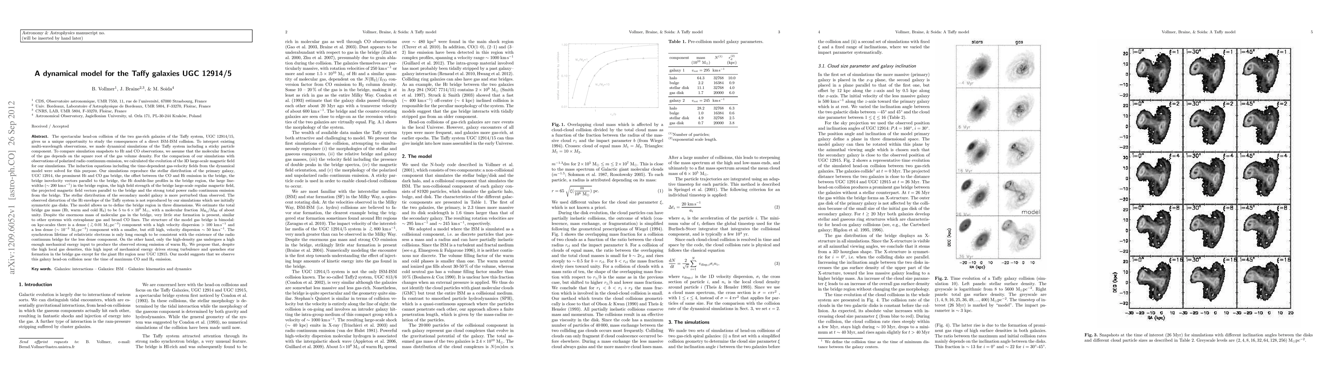 This paper presents a dynamical model of the Taffy galaxies UGC 12914/15, simulating their head-on collision and reproducing key observational features such as the gas bridge and magnetic field structure. The model estimates the bridge's mass and molecular fraction, but struggles to replicate the observed HI envelope distortion.