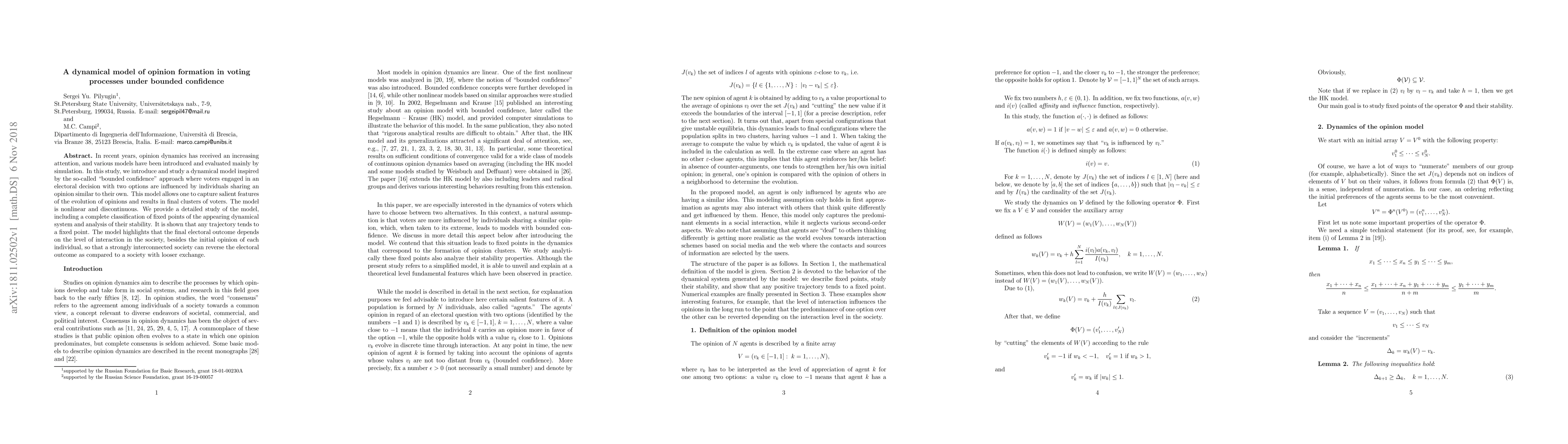 In recent years, opinion dynamics has received an increasing attention, and various models have been introduced and evaluated mainly by simulation. In this study, we introduce and study a dynamical model inspired by the so-called `bounded confidence' approach where voters engaged in an electoral decision with two options are influenced by individuals sharing an opinion similar to their own. This model allows one to capture salient features of the evolution of opinions and results in final clusters of voters. The model is nonlinear and discontinuous. We provide a detailed study of the model, including a complete classification of fixed points of the appearing dynamical system and analysis of their stability. It is shown that any trajectory tends to a fixed point. The model highlights that the final electoral outcome depends on the level of interaction in the society, besides the initial opinion of each individual, so that a strongly interconnected society can reverse the electoral outcome as compared to a society with looser exchange.
