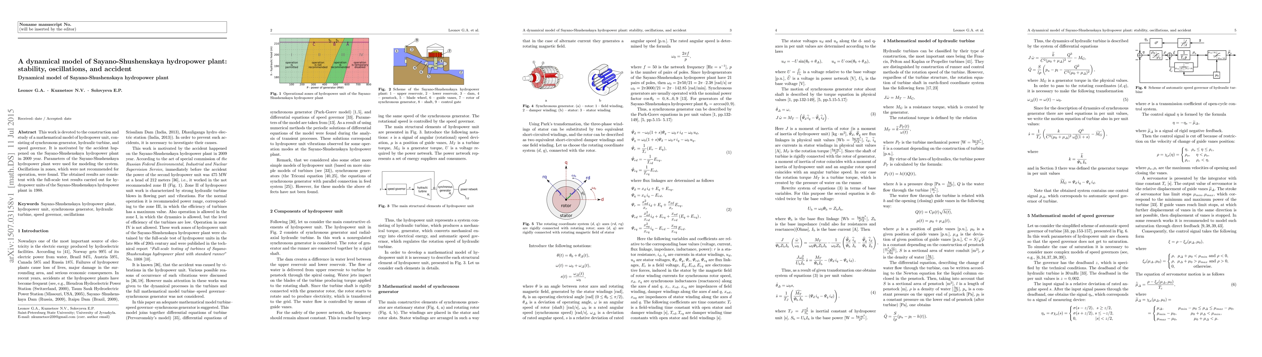 This paper constructs a mathematical model of the Sayano-Shushenskaya hydropower plant, analyzing its stability and oscillations, and identifies unsafe operation zones, corroborated by historical accident data and 1988 test results.