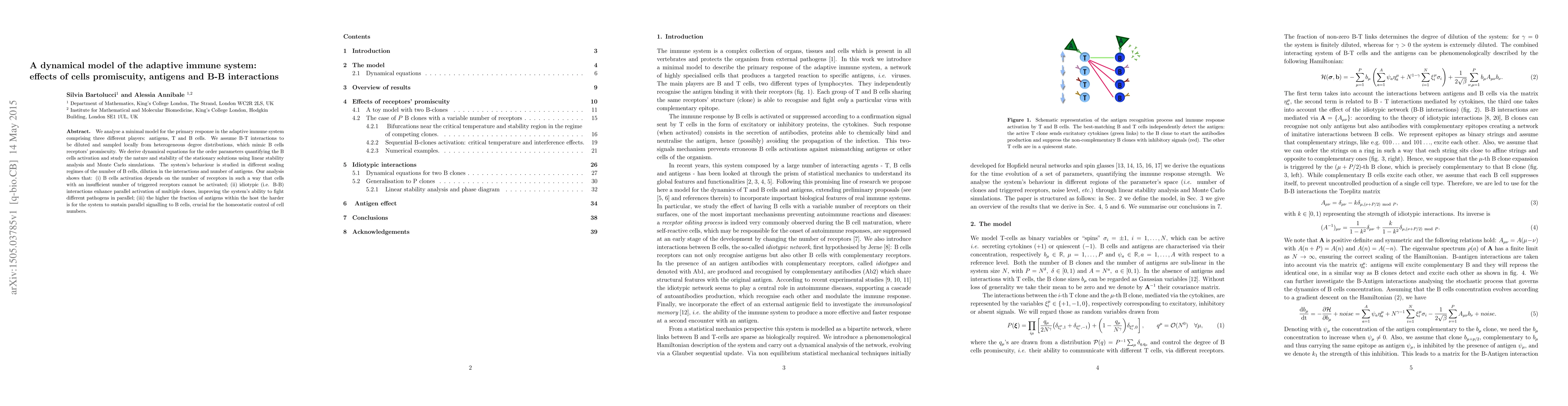 We analyse a minimal model for the primary response in the adaptive immune system comprising three different players: antigens, T and B cells. We assume B-T interactions to be diluted and sampled locally from heterogeneous degree distributions, which mimic B cells receptors' promiscuity. We derive dynamical equations for the order parameters quantifying the B cells activation and study the nature and stability of the stationary solutions using linear stability analysis and Monte Carlo simulations.The system's behaviour is studied in different scaling regimes of the number of B cells, dilution in the interactions and number of antigens. Our analysis shows that: (i) B cells activation depends on the number of receptors in such a way that cells with an insufficient number of triggered receptors cannot be activated; (ii) idiotypic (i.e. B-B) interactions enhance parallel activation of multiple clones, improving the system's ability to fight different pathogens in parallel; (iii) the higher the fraction of antigens within the host the harder is for the system to sustain parallel signalling to B cells, crucial for the homeostatic control of cell numbers.