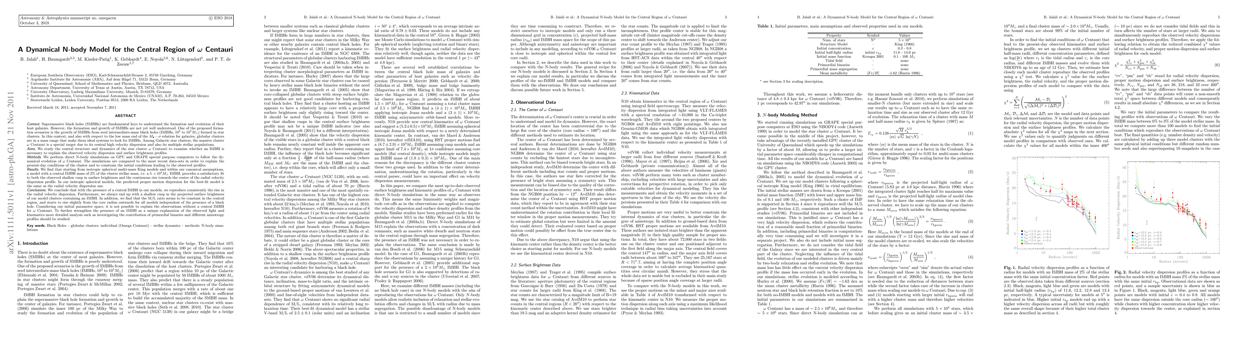 This paper investigates the central dynamics of the globular cluster $\omega$ Centauri using N-body simulations to determine if an intermediate-mass black hole (IMBH) is necessary to explain the observed velocity dispersion and surface brightness profiles. The simulations suggest a 5x10^4 M_{\odot} IMBH is required to match the observed data.