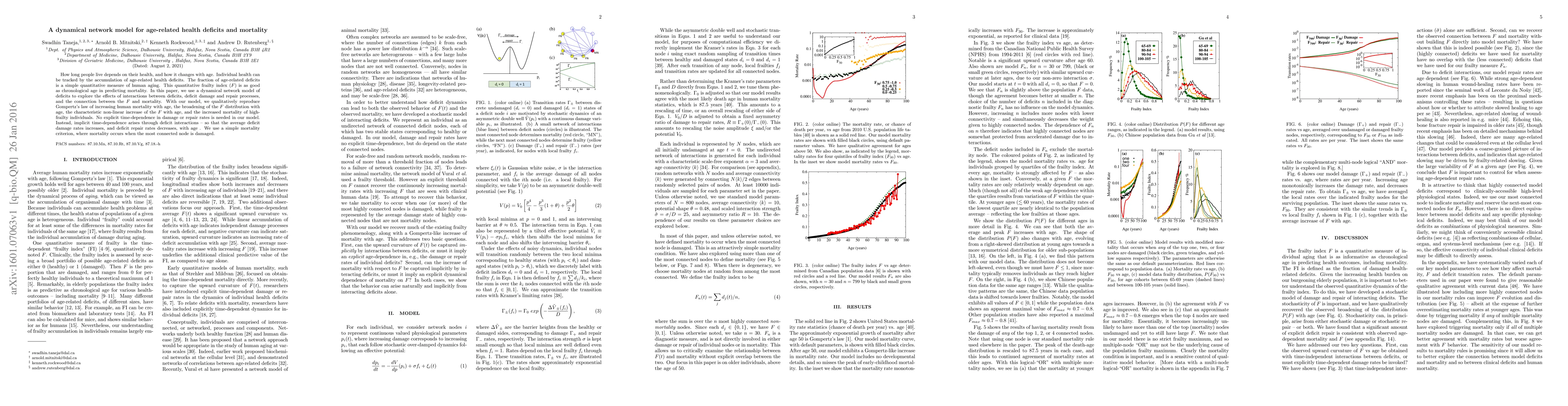 This paper develops a dynamical network model to explore age-related health deficits and mortality, showing that interactions between deficits lead to implicit time-dependence in damage and repair rates, and reproduces key aging patterns such as Gompertz's law, without requiring explicit time-dependence in rates. Mortality is predicted when the most connected deficit node is damaged.