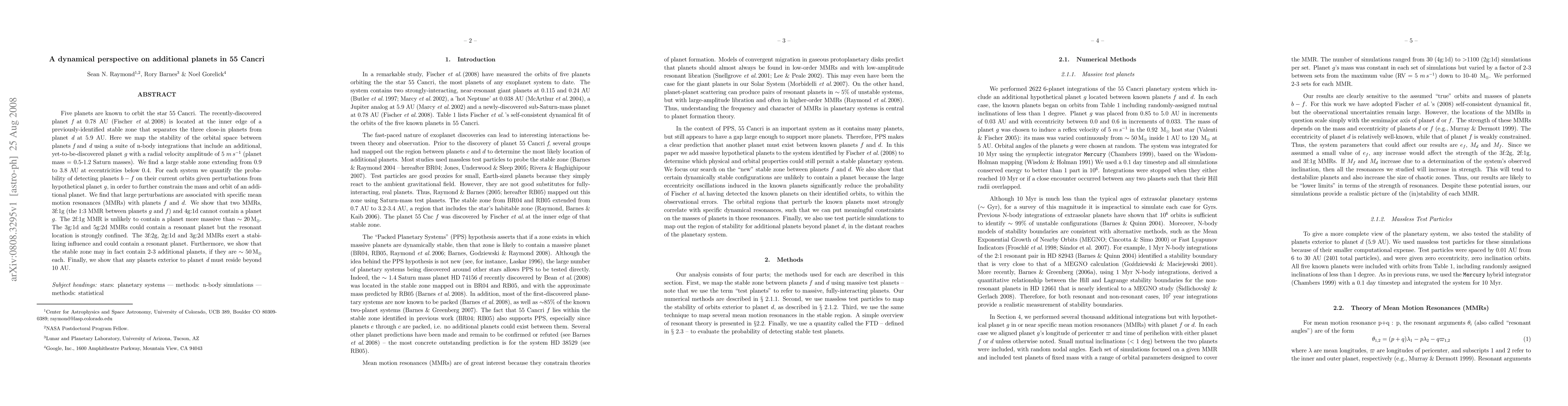 This paper explores the dynamical stability of the 55 Cancri planetary system, focusing on the potential existence of an additional planet g. It finds a large stable zone between the known planets f and d, and identifies specific mean motion resonances that could or could not contain a planet g, suggesting the system may hold 2-3 additional massive planets.