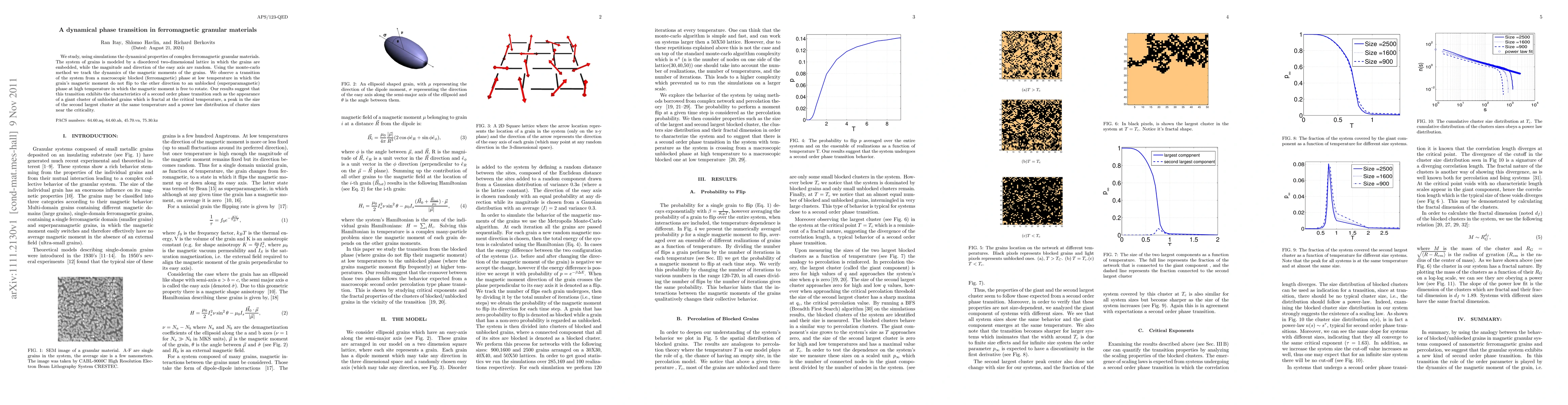 This paper investigates the dynamical phase transition in ferromagnetic granular materials using Monte Carlo simulations. It finds a transition from a blocked ferromagnetic phase at low temperatures to a superparamagnetic phase at high temperatures, exhibiting characteristics of a second-order phase transition, including fractal giant clusters and a peak in the size of the second largest cluster at the critical temperature.