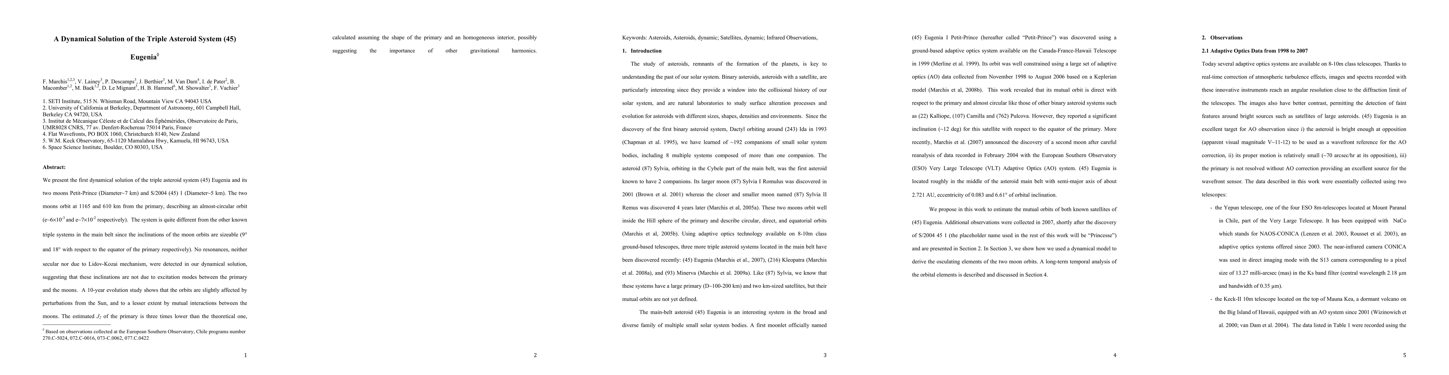 We present the first dynamical solution of the triple asteroid system (45) Eugenia and its two moons Petit-Prince (Diameter~7 km) and S/2004 (45) 1 (Diameter~5 km). The two moons orbit at 1165 and 610 km from the primary, describing an almost-circular orbit (e~6x10-3 and e~7x10-2 respectively). The system is quite different from the other known triple systems in the main belt since the inclinations of the moon orbits are sizeable (9 deg and 18 deg with respect to the equator of the primary respectively). No resonances, neither secular nor due to Lidov-Kozai mechanism, were detected in our dynamical solution, suggesting that these inclinations are not due to excitation modes between the primary and the moons. A 10-year evolution study shows that the orbits are slightly affected by perturbations from the Sun, and to a lesser extent by mutual interactions between the moons. The estimated J2 of the primary is three times lower than the theoretical one, calculated assuming the shape of the primary and an homogeneous interior, possibly suggesting the importance of other gravitational harmonics.