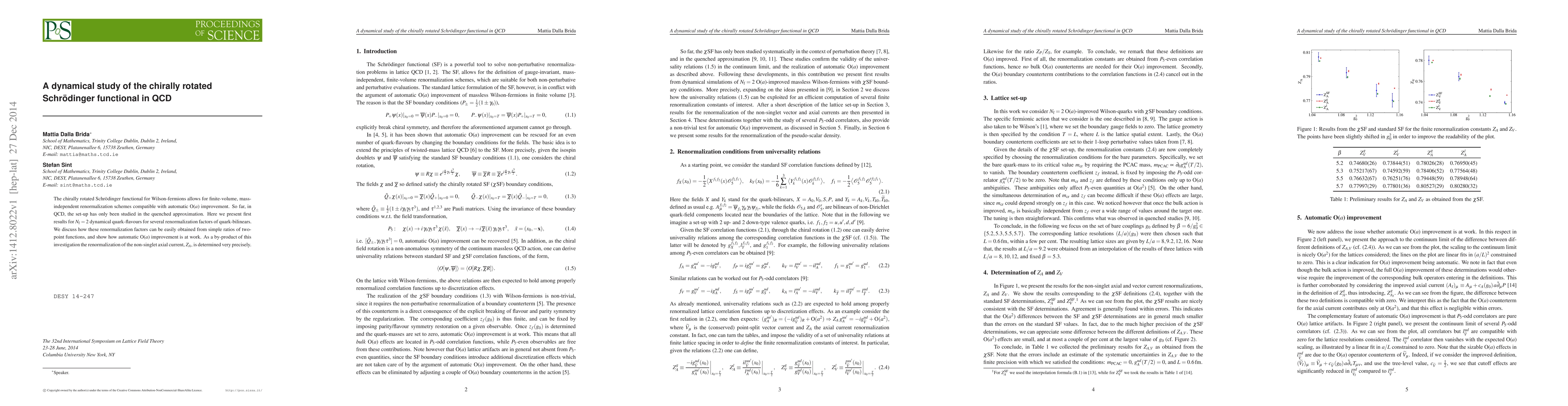 This study explores the chirally rotated Schrödinger functional in QCD with two dynamical quark flavors, providing finite-volume, mass-independent renormalization schemes. It demonstrates automatic O($a$) improvement and precisely determines the renormalization factor for the non-singlet axial current, $Z_A$, through simple ratios of two-point functions.