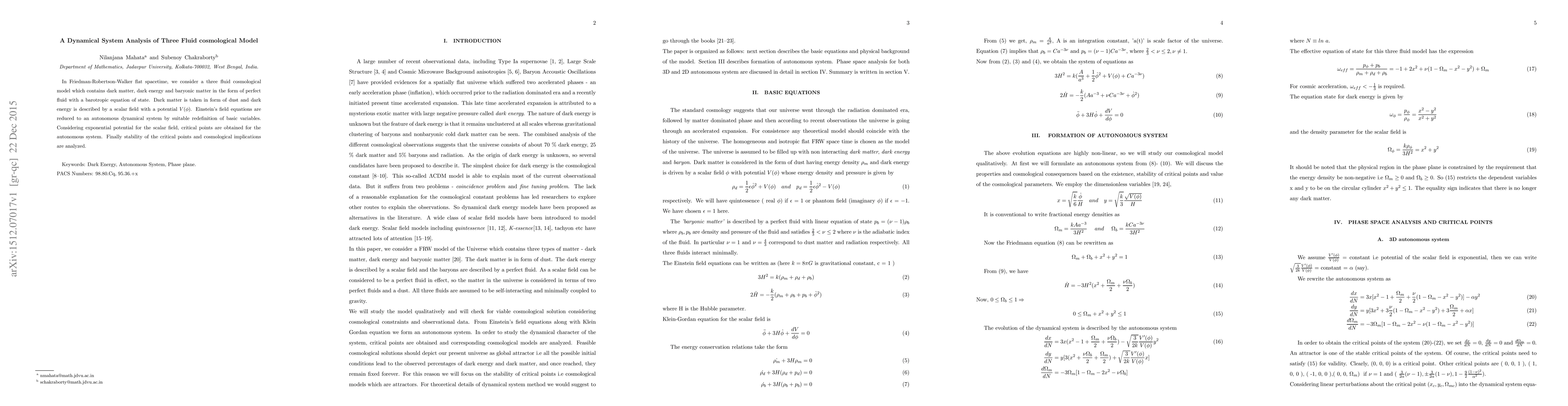 In Friedman-Robertson-Walker flat spacetime, we consider a three fluid cosmological model which contains dark matter, dark energy and baryonic matter in the form of perfect fluid with a barotropic equation of state. Dark matter is taken in form of dust and dark energy is described by a scalar field with a potential $V(\phi)$. Einstein's field equations are reduced to an autonomous dynamical system by suitable redefinition of basic variables. Considering exponential potential for the scalar field, critical points are obtained for the autonomous system. Finally stability of the critical points and cosmological implications are analyzed.