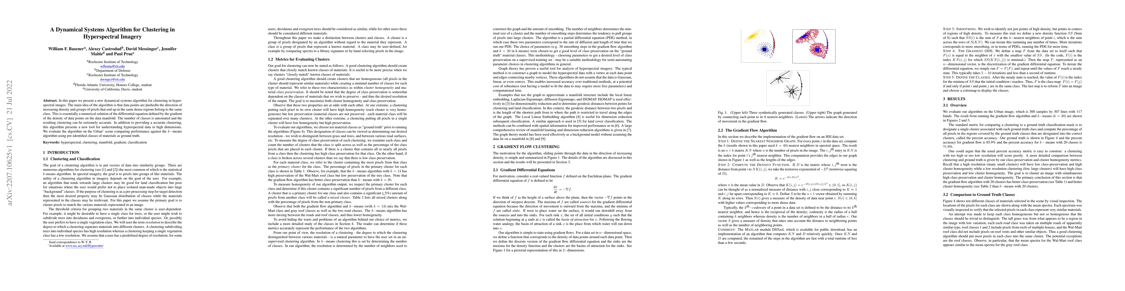 In this paper we present a new dynamical systems algorithm for clustering in hyperspectral images. The main idea of the algorithm is that data points are \`pushed\' in the direction of increasing density and groups of pixels that end up in the same dense regions belong to the same class. This is essentially a numerical solution of the differential equation defined by the gradient of the density of data points on the data manifold. The number of classes is automated and the resulting clustering can be extremely accurate. In addition to providing a accurate clustering, this algorithm presents a new tool for understanding hyperspectral data in high dimensions. We evaluate the algorithm on the Urban (Available at www.tec.ary.mil/Hypercube/) scene comparing performance against the k-means algorithm using pre-identified classes of materials as ground truth.