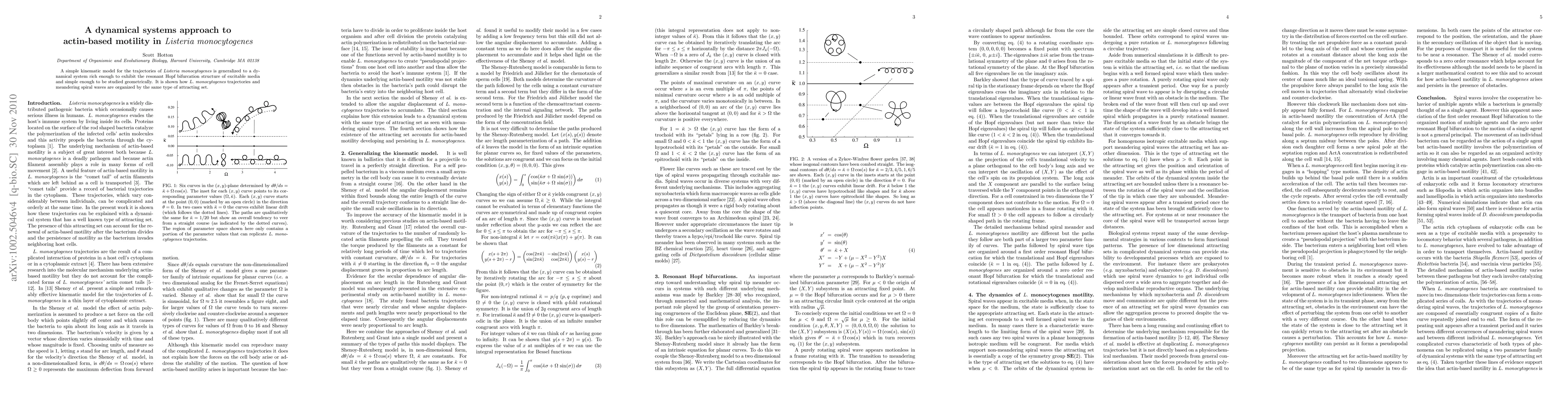 A simple kinematic model for the trajectories of Listeria monocytogenes is generalized to a dynamical system rich enough to exhibit the resonant Hopf bifurcation structure of excitable media and simple enough to be studied geometrically. It is shown how L. monocytogenes trajectories and meandering spiral waves are organized by the same type of attracting set.