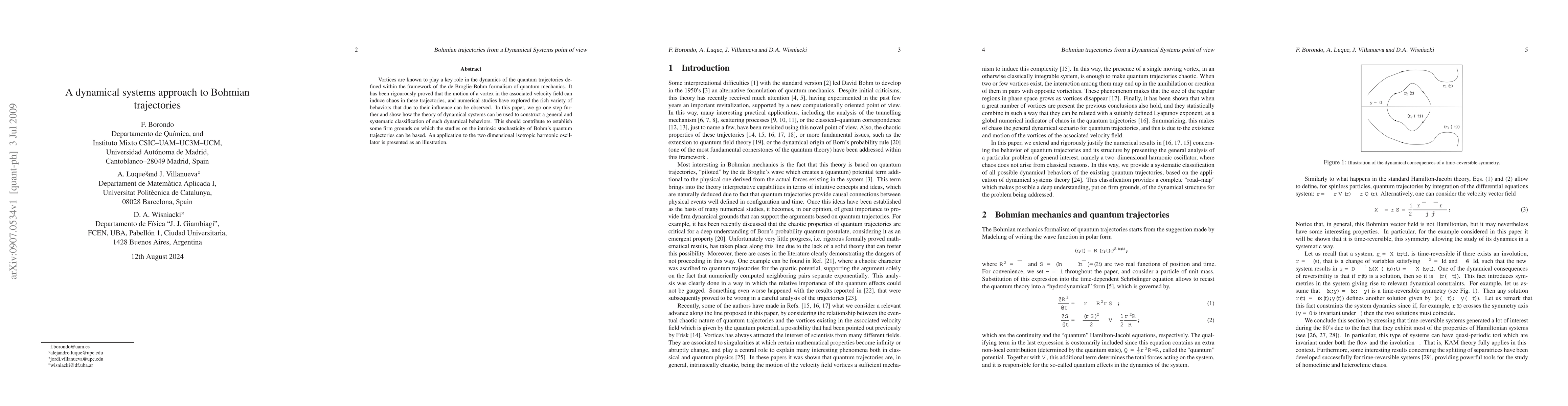 Vortices are known to play a key role in the dynamics of the quantum trajectories defined within the framework of the de Broglie-Bohm formalism of quantum mechanics. It has been rigourously proved that the motion of a vortex in the associated velocity field can induce chaos in these trajectories, and numerical studies have explored the rich variety of behaviors that due to their influence can be observed. In this paper, we go one step further and show how the theory of dynamical systems can be used to construct a general and systematic classification of such dynamical behaviors. This should contribute to establish some firm grounds on which the studies on the intrinsic stochasticity of Bohm's quantum trajectories can be based. An application to the two dimensional isotropic harmonic oscillator is presented as an illustration.