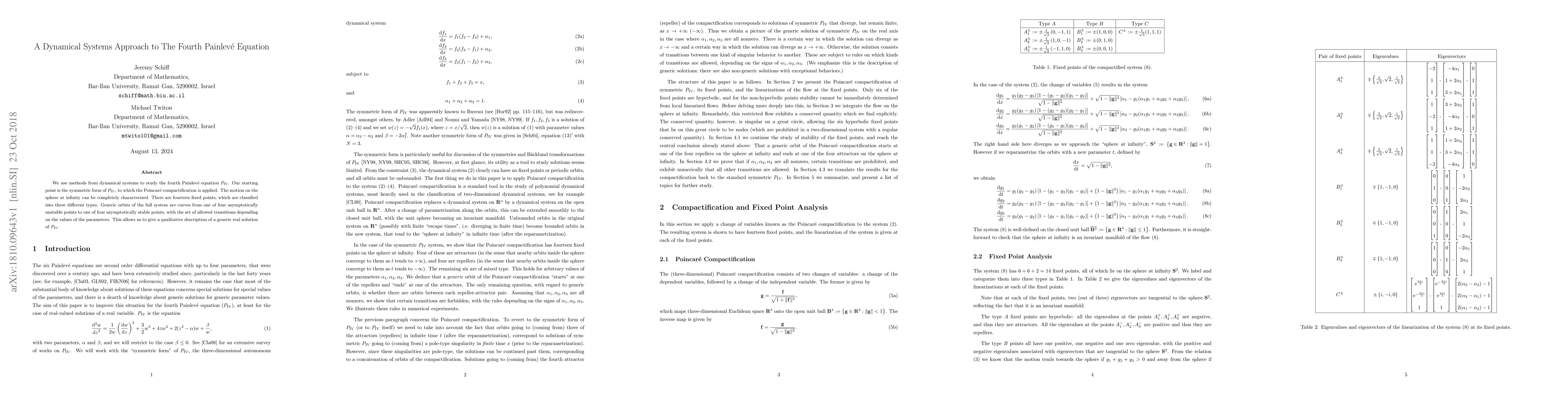The paper uses dynamical systems to study the fourth Painleve equation, identifying 14 fixed points and describing generic real solutions as curves between unstable and stable points with varying transition rules.