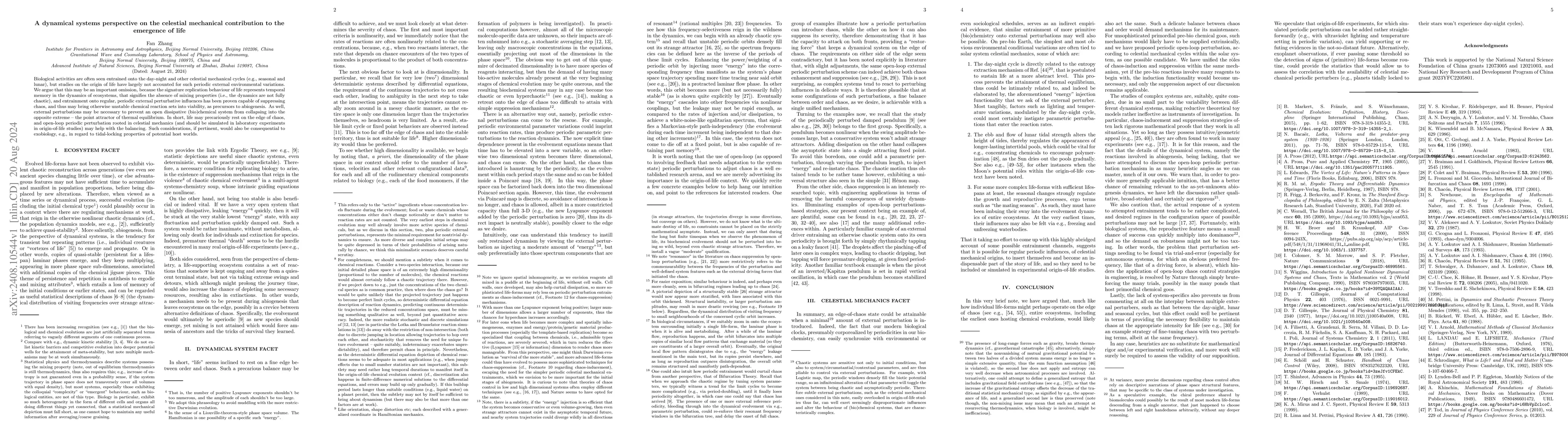 This paper posits that celestial mechanical cycles may play a crucial role in the emergence of life by entraining biological activities and suppressing chaos in chemical reactions, thereby fostering conditions conducive to abiogenesis. It suggests periodic perturbations from celestial mechanics should be integrated into origin-of-life studies to explore this hypothesis.