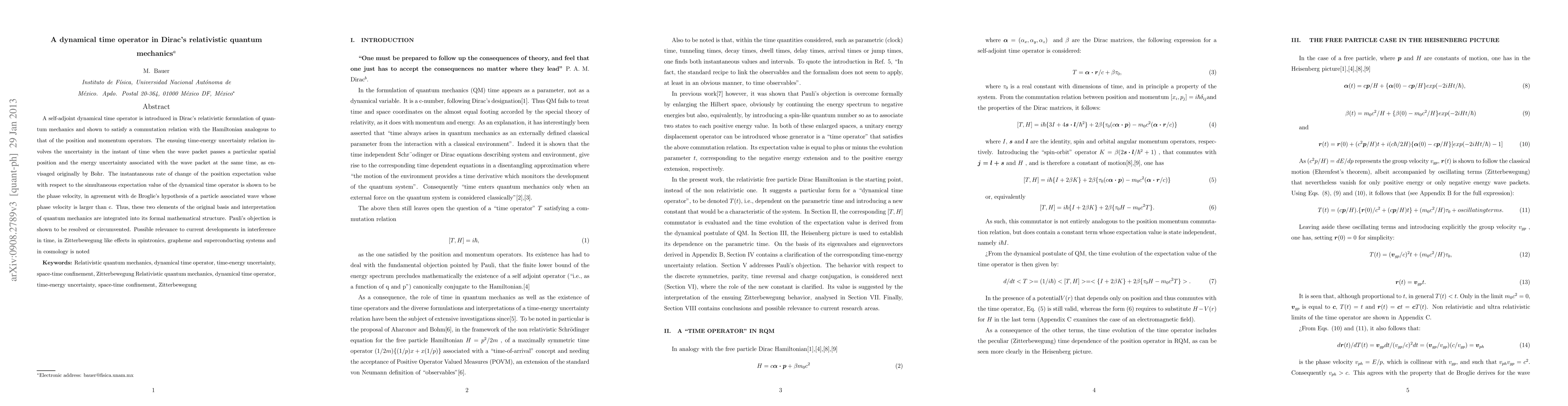 A self-adjoint dynamical time operator is introduced in Dirac's relativistic formulation of quantum mechanics and shown to satisfy a commutation relation with the Hamiltonian analogous to that of the position and momentum operators. The ensuing time-energy uncertainty relation involves the uncertainty in the instant of time when the wave packet passes a particular spatial position and the energy uncertainty associated with the wave packet at the same time, as envisaged originally by Bohr. The instantaneous rate of change of the position expectation value with respect to the simultaneous expectation value of the dynamical time operator is shown to be the phase velocity, in agreement with de Broglie's hypothesis of a particle associated wave whose phase velocity is larger than c. Thus, these two elements of the original basis and interpretation of quantum mechanics are integrated into its formal mathematical structure. Pauli's objection is shown to be resolved or circumvented. Possible relevance to current developments in interference in time, in Zitterbewegung like effects in spintronics, grapheme and superconducting systems and in cosmology is noted.
