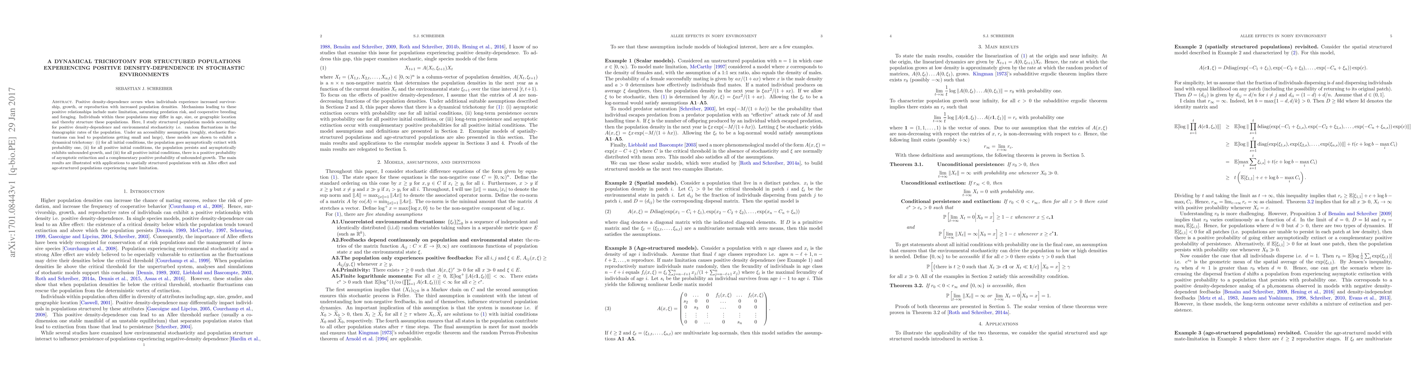 This paper investigates structured population models with positive density-dependence and environmental stochasticity, revealing a dynamical trichotomy: populations either go extinct, persist with unbounded growth, or exhibit a mix of extinction and growth with positive probabilities. The study applies these findings to spatially and age-structured populations.