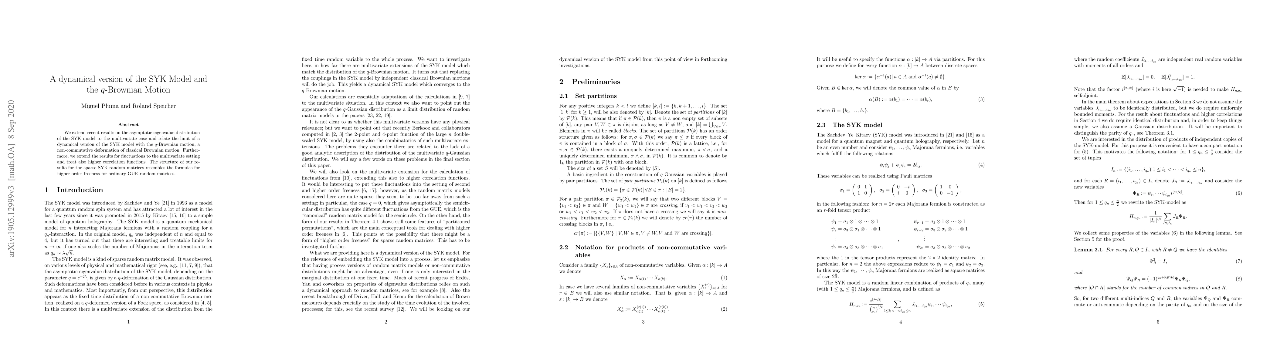 This paper extends the SYK model to multivariate cases and relates it to q-Brownian motion, showing similarities with higher-order freeness formulas in ordinary GUE random matrices.