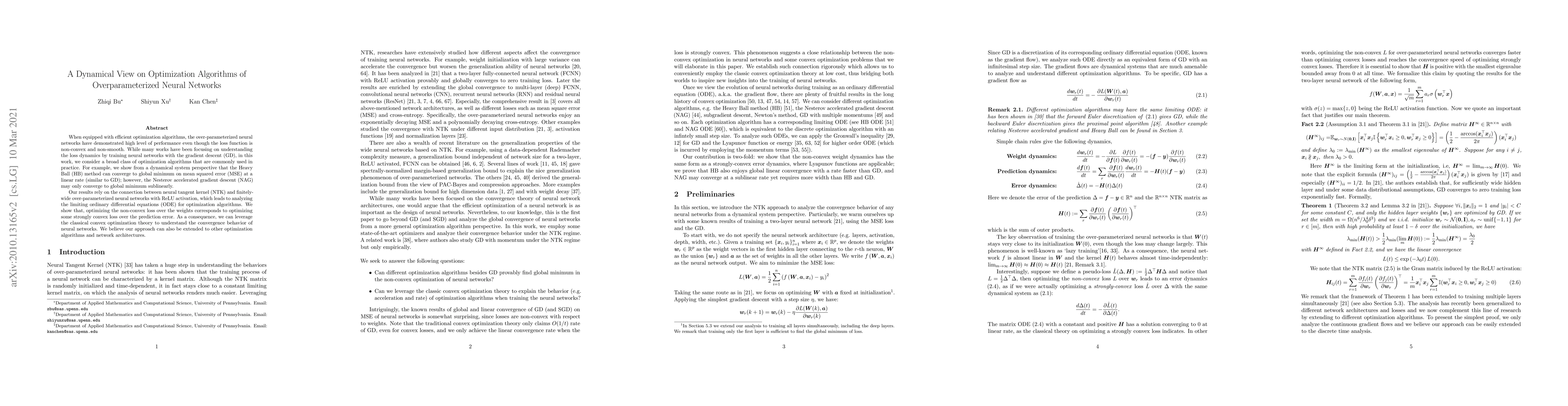 This research analyzes optimization algorithms for overparameterized neural networks, focusing on Heavy Ball (HB) and Nesterov accelerated gradient descent (NAG). It reveals that HB converges to the global minimum linearly, similar to gradient descent, while NAG converges sublinearly. The study uses a dynamical system perspective, connecting neural tangent kernel (NTK) to finite overparameterized networks with ReLU activation, and leverages classical convex optimization theory to understand convergence behavior.