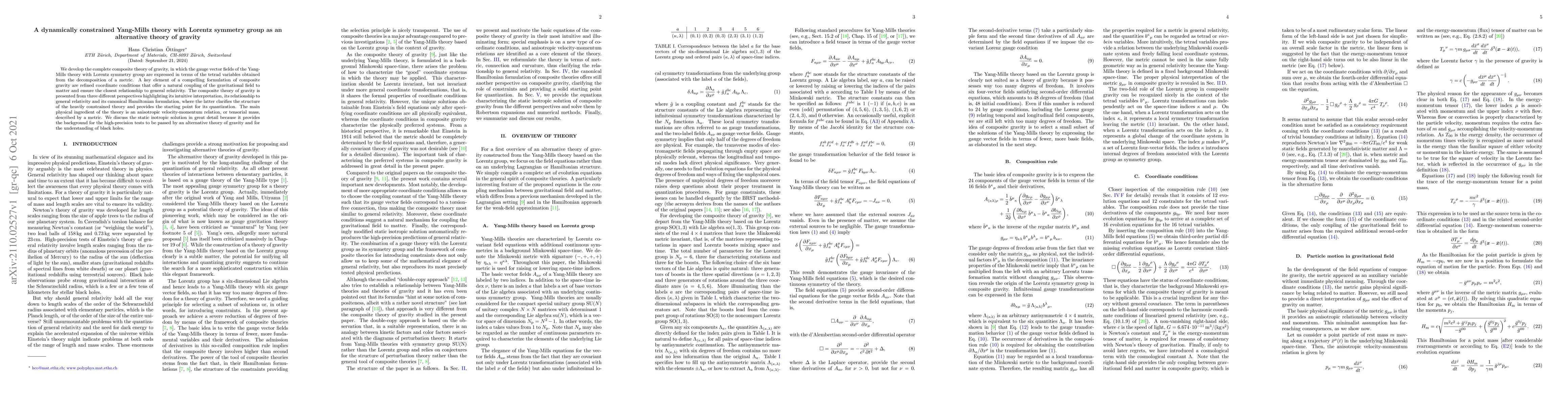 This paper develops a composite theory of gravity using Yang-Mills fields with Lorentz symmetry, expressed via tetrad variables from metric decomposition. It emphasizes refined coordinate conditions for natural coupling to matter and a detailed static isotropic solution for precision tests and black hole understanding.