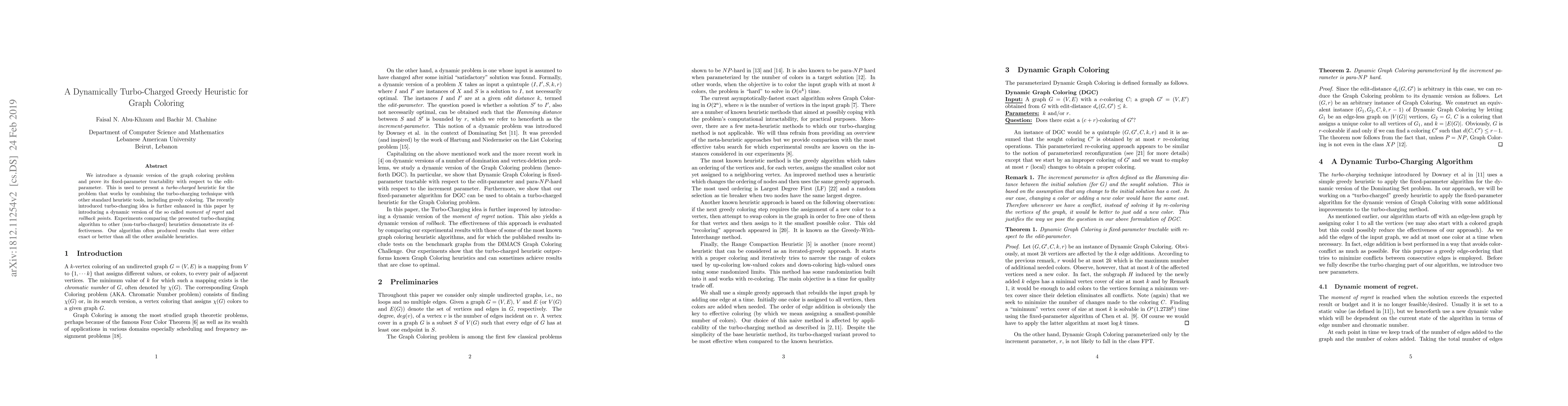 This paper presents a dynamically turbo-charged greedy heuristic for graph coloring, proving its fixed-parameter tractability. The enhanced turbo-charging technique, incorporating dynamic regret moments and rollback points, outperforms other heuristics in experiments, often achieving exact or superior results.