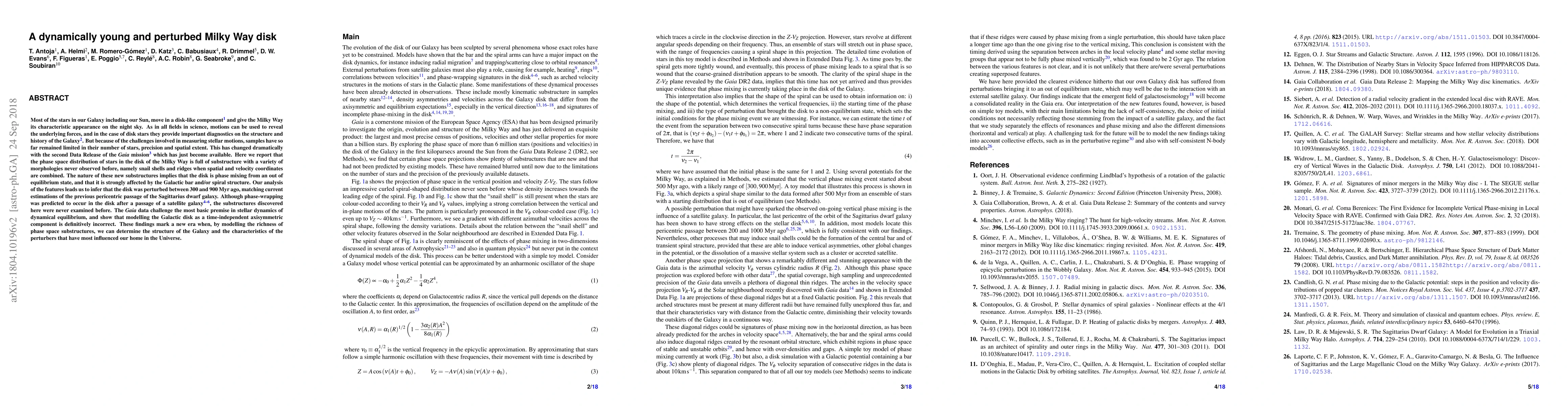 This paper analyzes the motions of six million Milky Way stars, revealing complex substructures like snail shells and ridges, indicating significant perturbations occurred between 300-900 million years ago. These findings demonstrate the Milky Way disk is dynamically young and non-equilibrium, challenging time-independent, axisymmetric models.