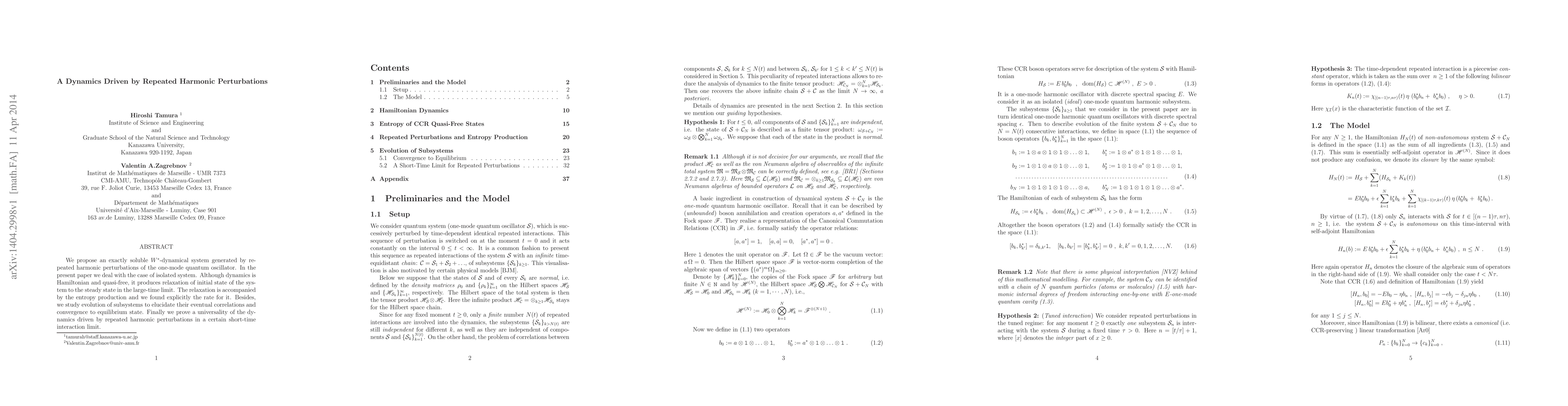 We propose an exactly soluble W*-dynamical system generated by repeated harmonic perturbations of the one-mode quantum oscillator. In the present paper we deal with the case of isolated system. Although dynamics is Hamiltonian and quasi-free, it produces relaxation of initial state of the system to the steady state in the large-time limit. The relaxation is accompanied by the entropy production and we found explicitly the rate for it. Besides, we study evolution of subsystems to elucidate their eventual correlations and convergence to equilibrium state. Finally we prove a universality of the dynamics driven by repeated harmonic perturbations in a certain short-time interaction limit.