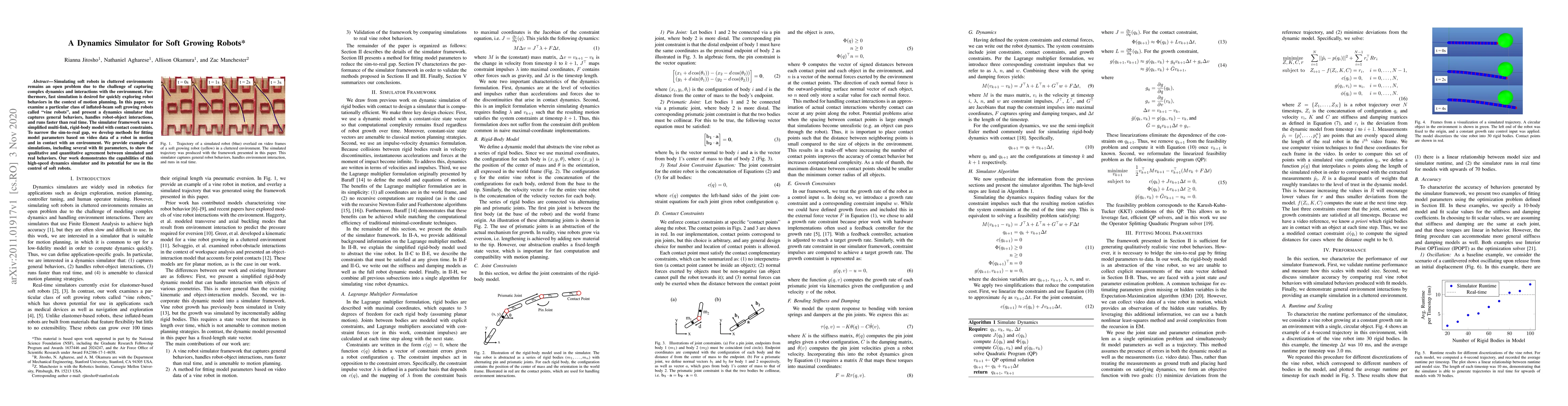 The paper introduces a computationally efficient dynamics simulator for soft growing robots, utilizing a simplified multi-link rigid-body model with contact constraints and a fitting procedure to bridge the sim-to-real gap.