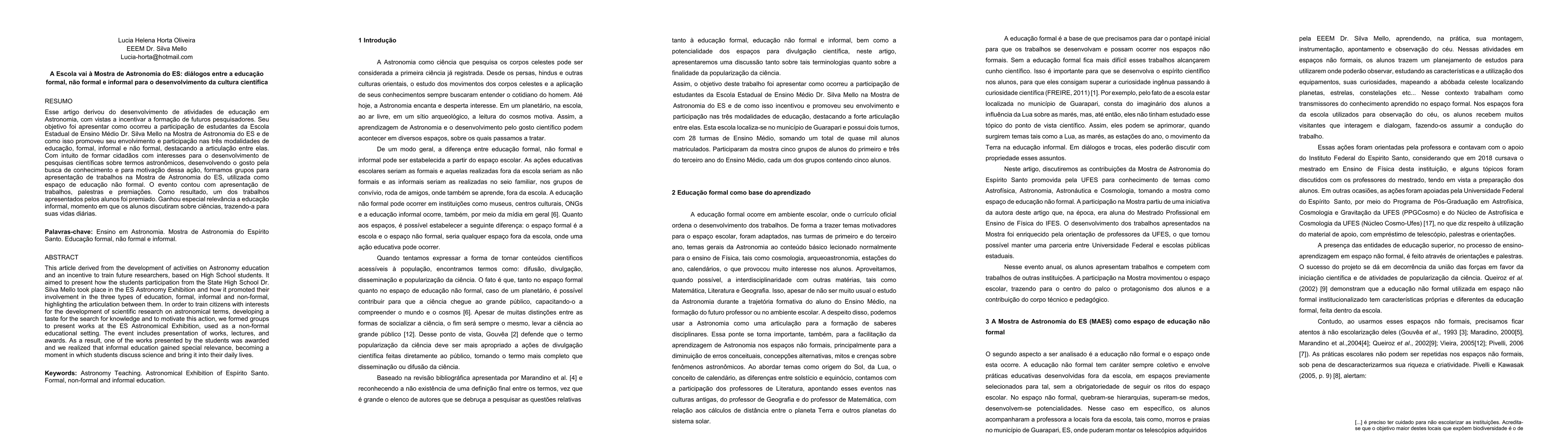 This article is derived from the development of educational activities in astronomy, with a view to encouraging the training of future researchers. The goal is to present how the participation of students from EEEM Dr.Silva Mello took place in the Mostra de Astronomia do ES (MAES), and how that promoted their involvement and participation in the three types of education, formal, informal and non-formal, highlighting the articulation between them. In order to train citizens with interests for development of scientific research on astronomical themes, developing a taste for the search for knowledge and to motivate this action, we form groups to present works at MAES, used as a non-formal education space . The event included the presentation of works, lectures and prizes. As a result, one of the works presented by the students was awarded. Informal education has gained special relevance, when students discussed science, bringing it to their daily lives