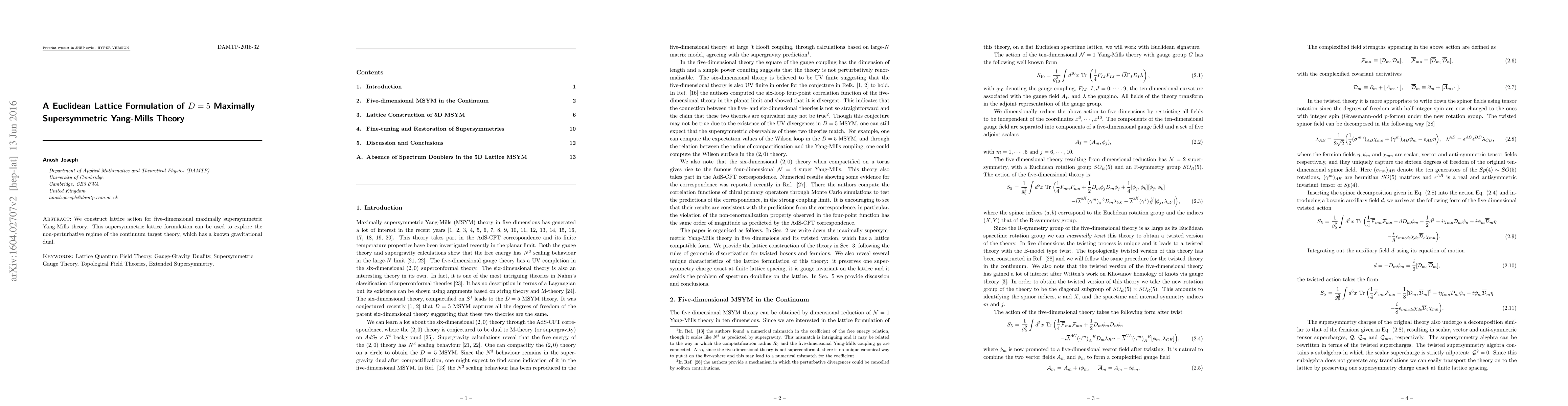 This paper develops a lattice action for five-dimensional maximally supersymmetric Yang-Mills theory, enabling non-perturbative exploration of its continuum theory with a known gravitational dual. The lattice formulation provides a tool for studying the strong coupling regime of this supersymmetric gauge theory.